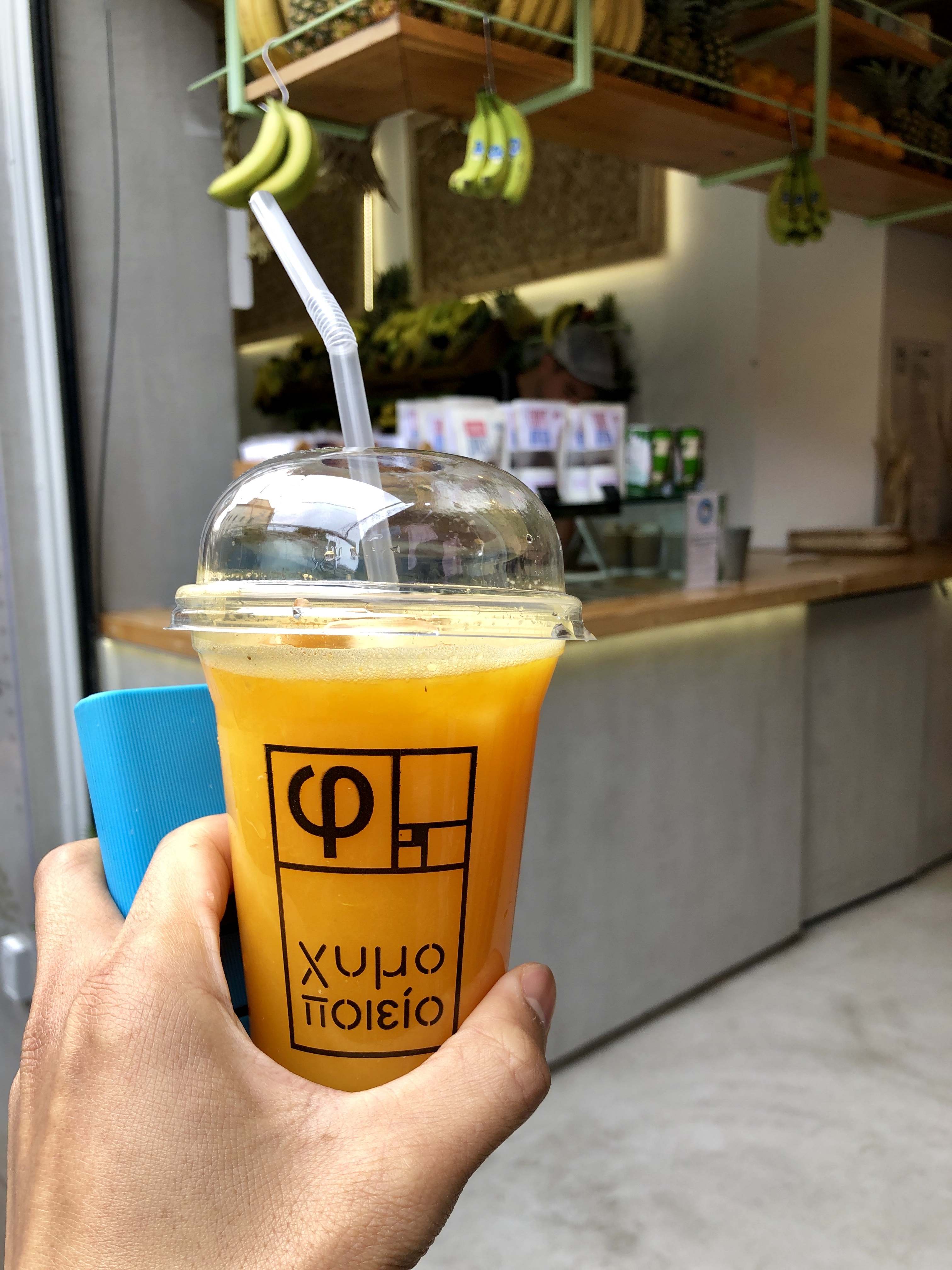 다니다 보니 살짝 목이 말라 신선한 그리스의 과일주스 한잔을 마셔본다.