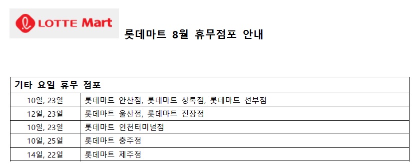 오늘은 8월 롯데마트 휴무일에 대해서 알아보았습니다.