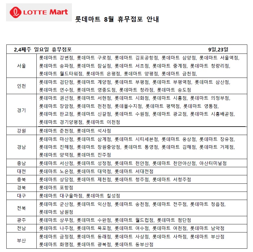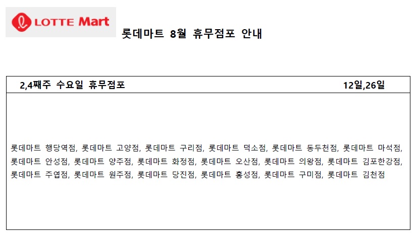 두번째로 휴무일이 많은 2,4째주 수요일인 8월12일과 26일에도 많은 롯데마트가 휴무하게 됩니다.