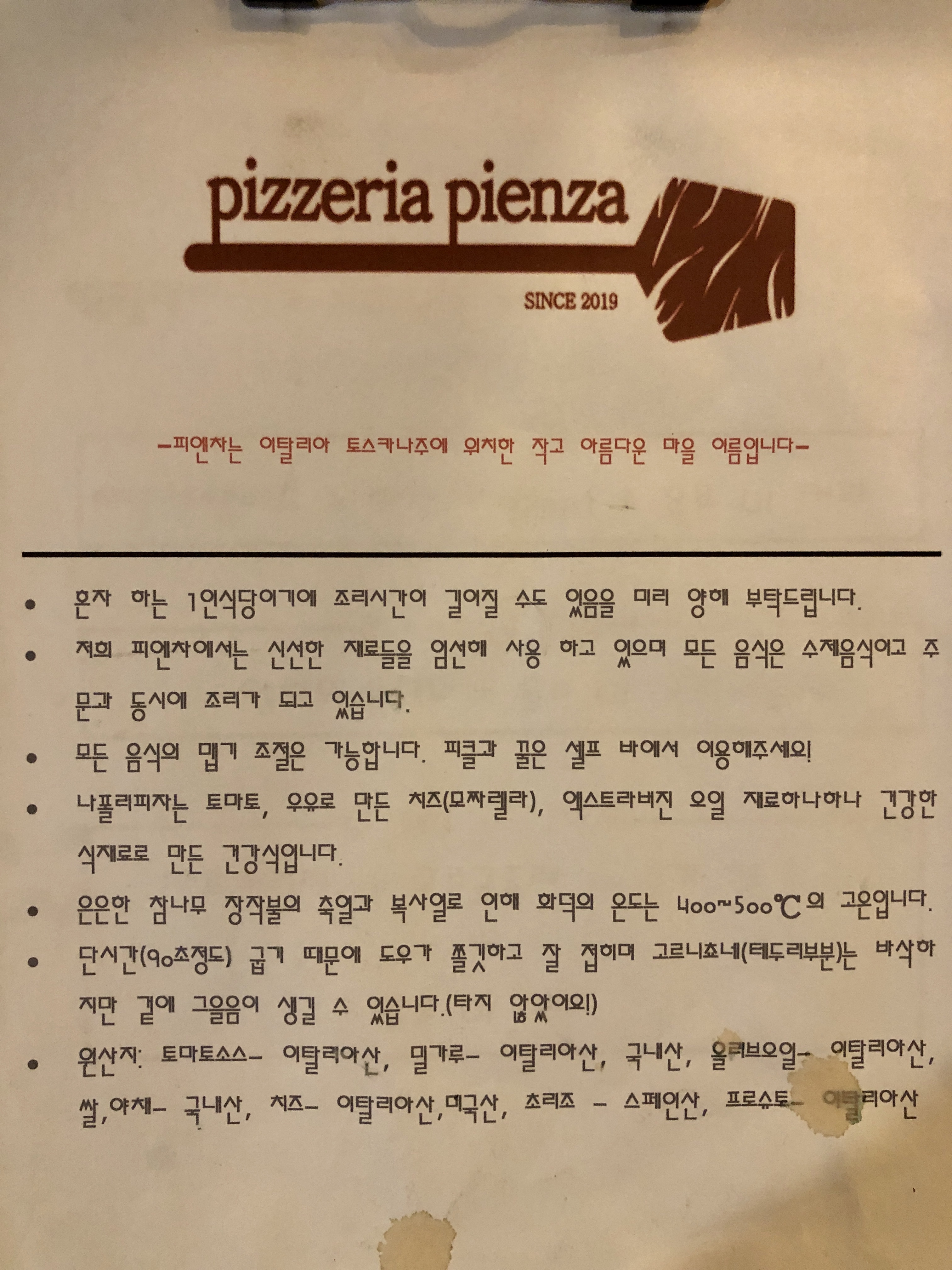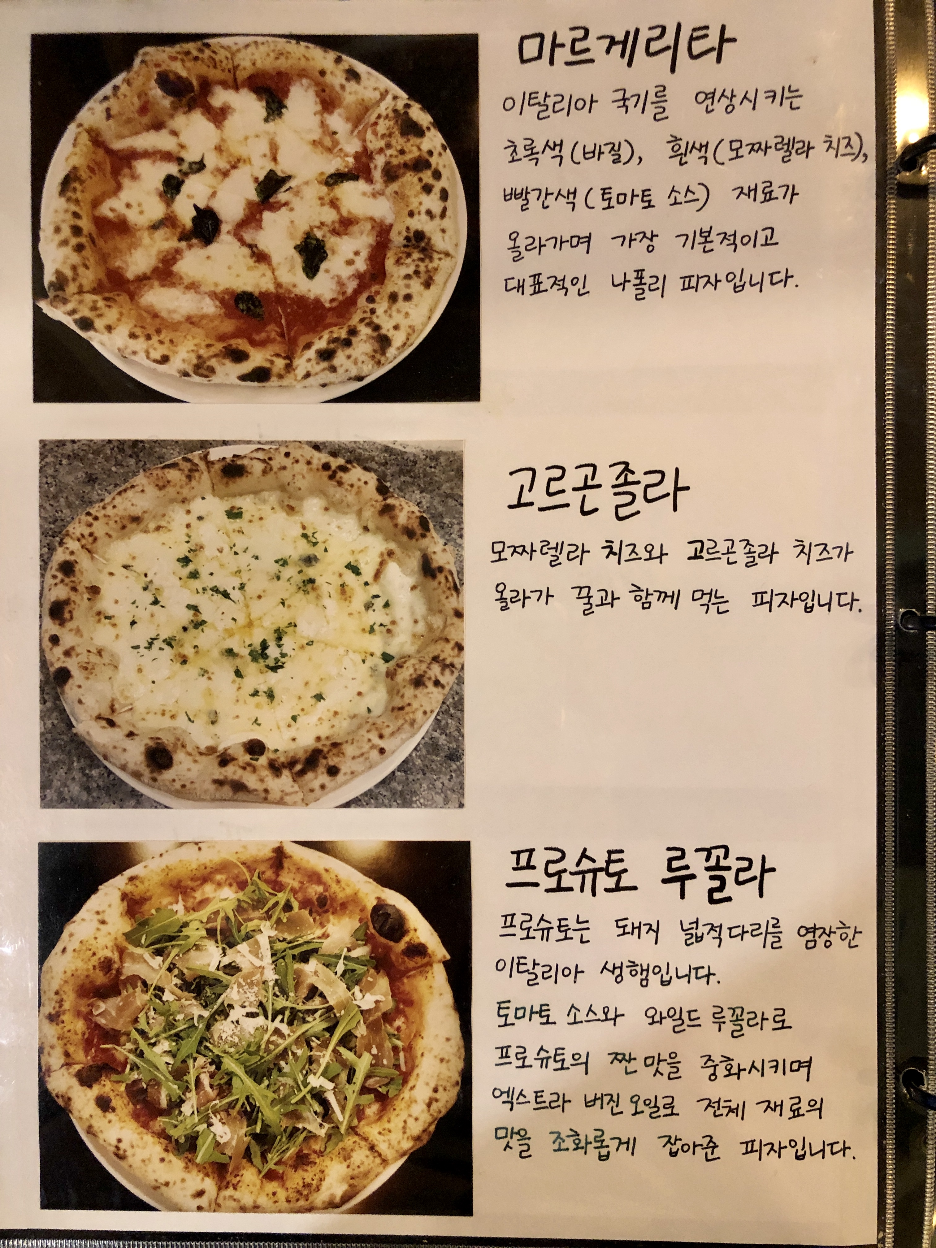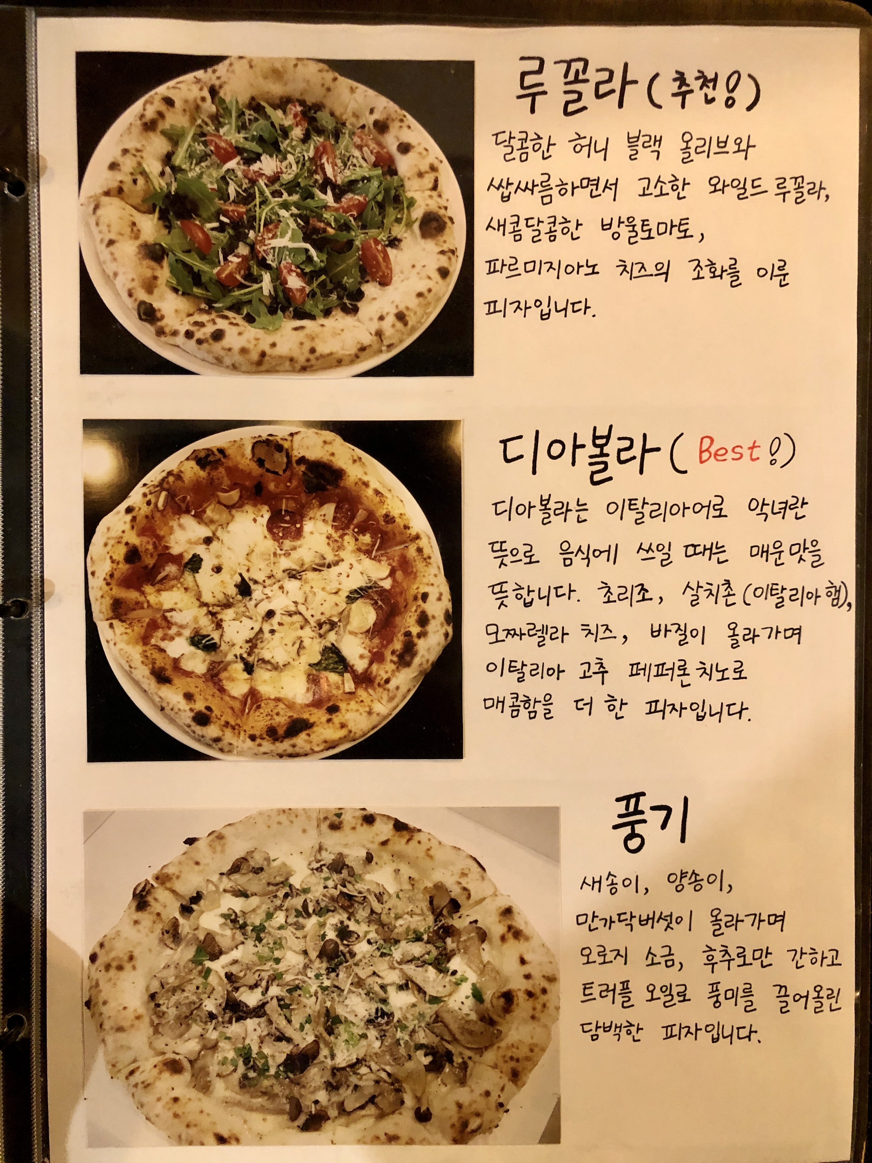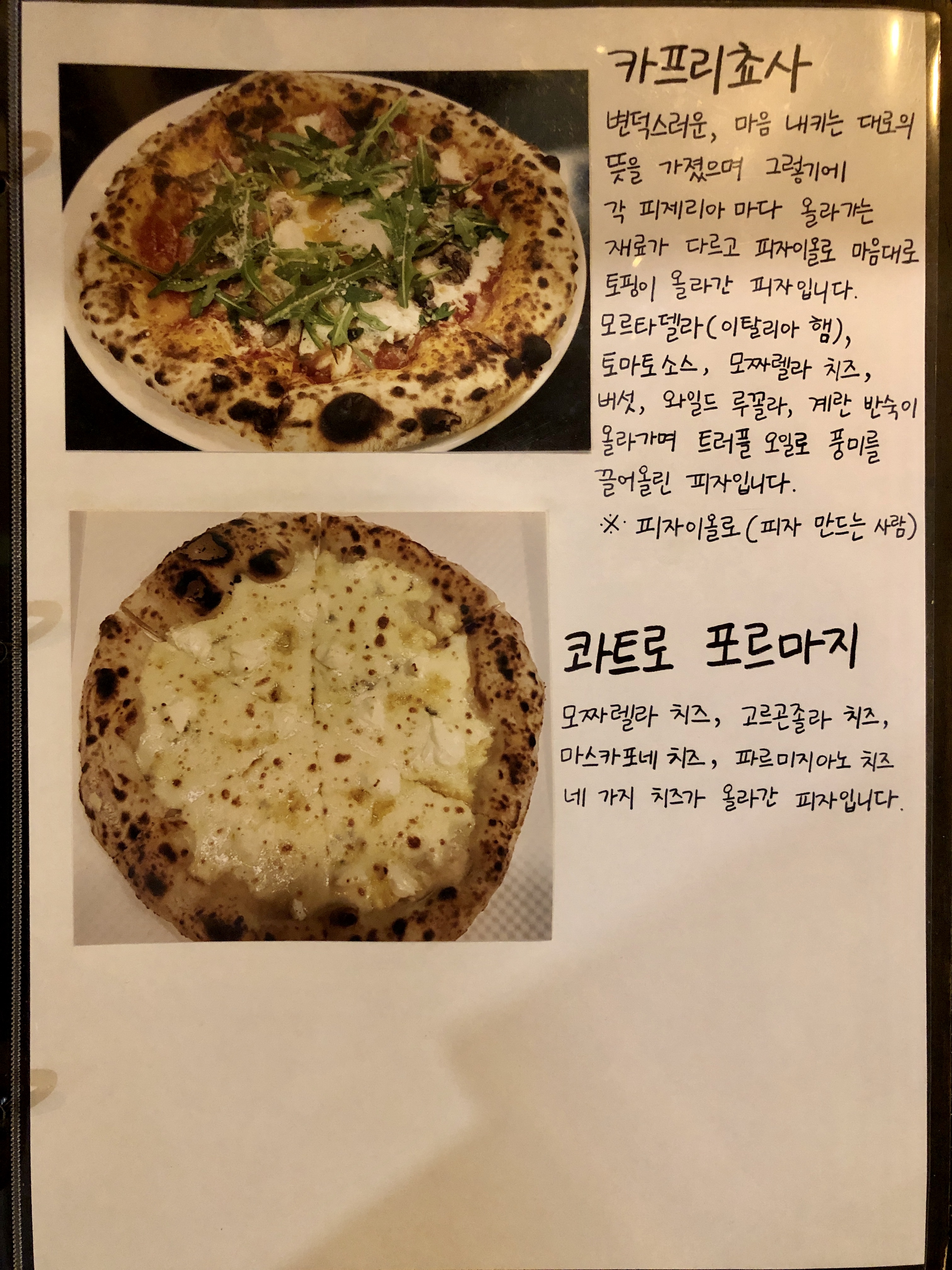 각 피자 메뉴마다 상세하고 정성스럽게 손글씨로 특징을 써주셨어요!