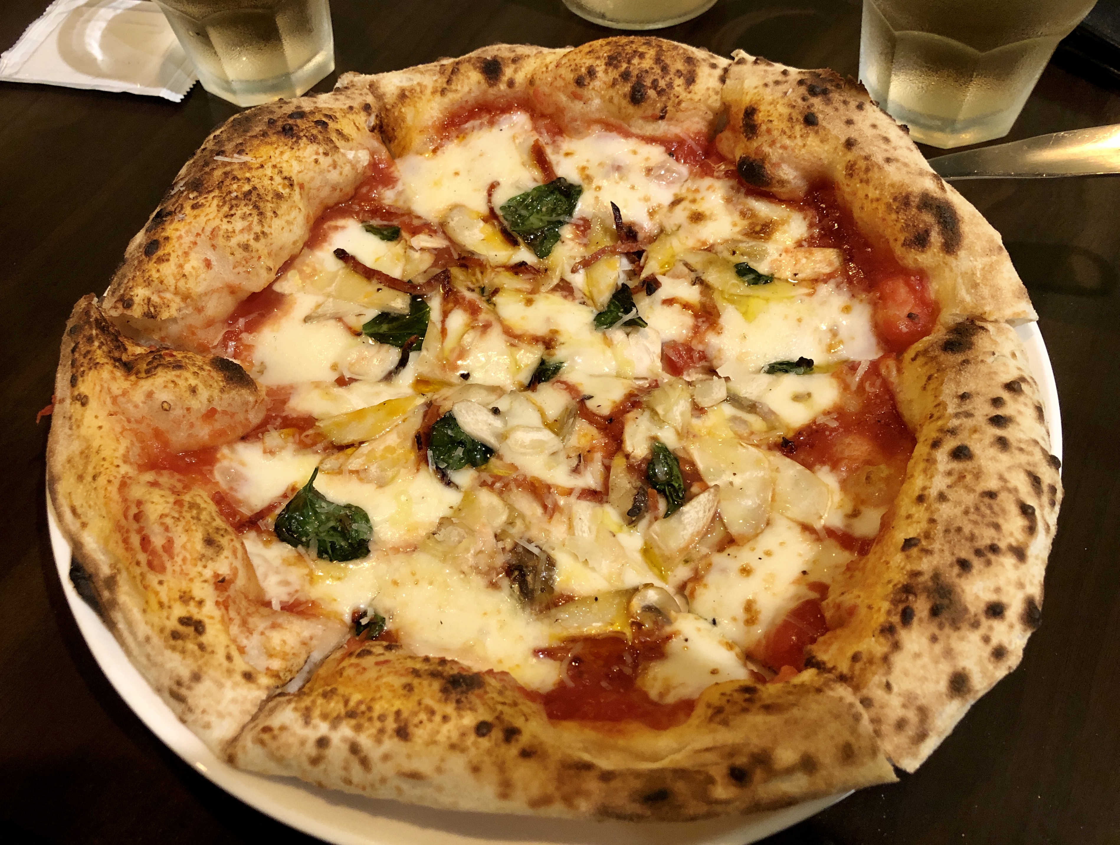 초리조, 살치촌(이탈리아 햄), 모짜렐라 치즈, 바질이 올라간 피자로 이탈리아 고추 페퍼론치노로 매콤함을