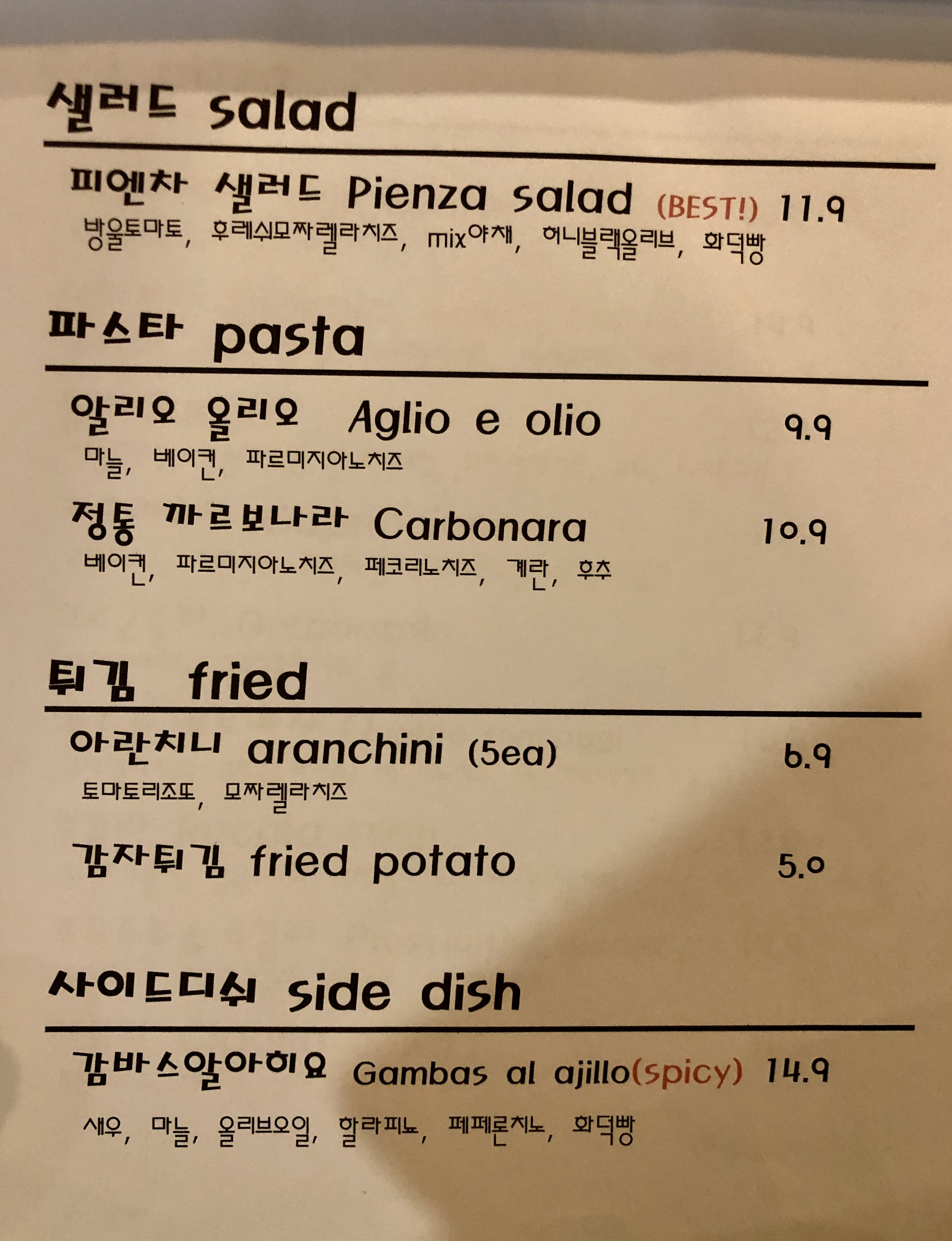 저희는 피자와 함께 먹을 메뉴로 피엔차 샐러드를 함께 주문하였습니다.