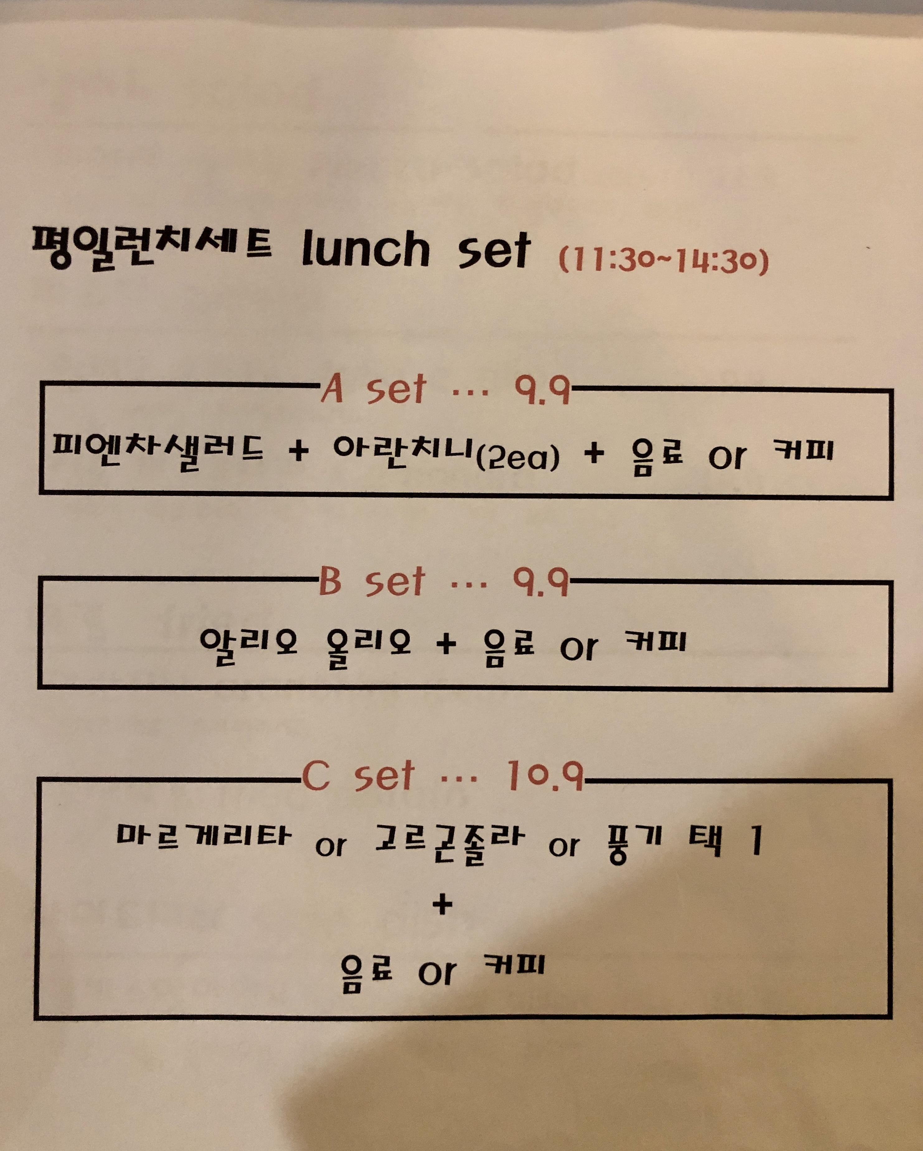 피엔차는 평일 런치세트도 따로 판매하고 계시더라구요!