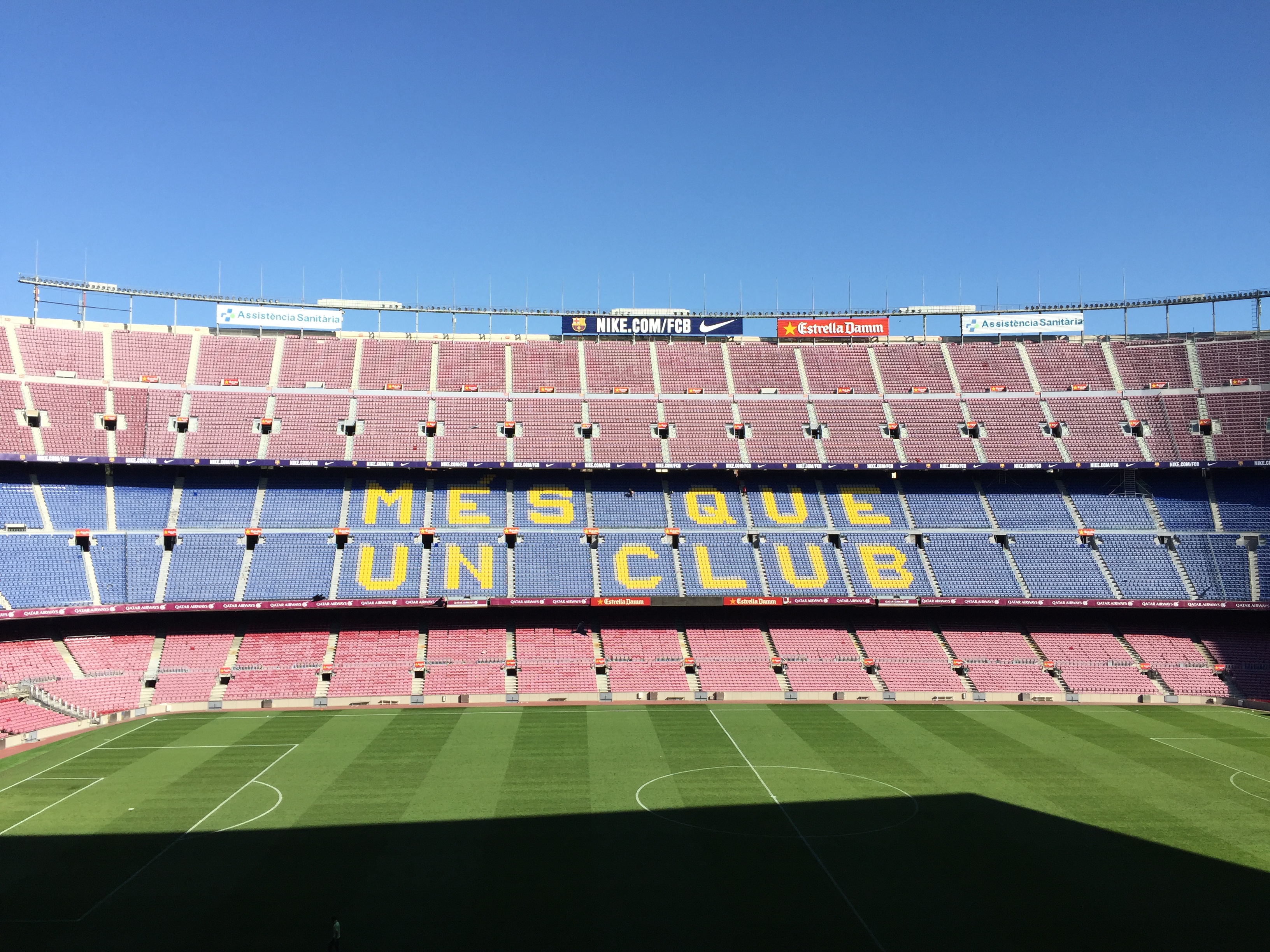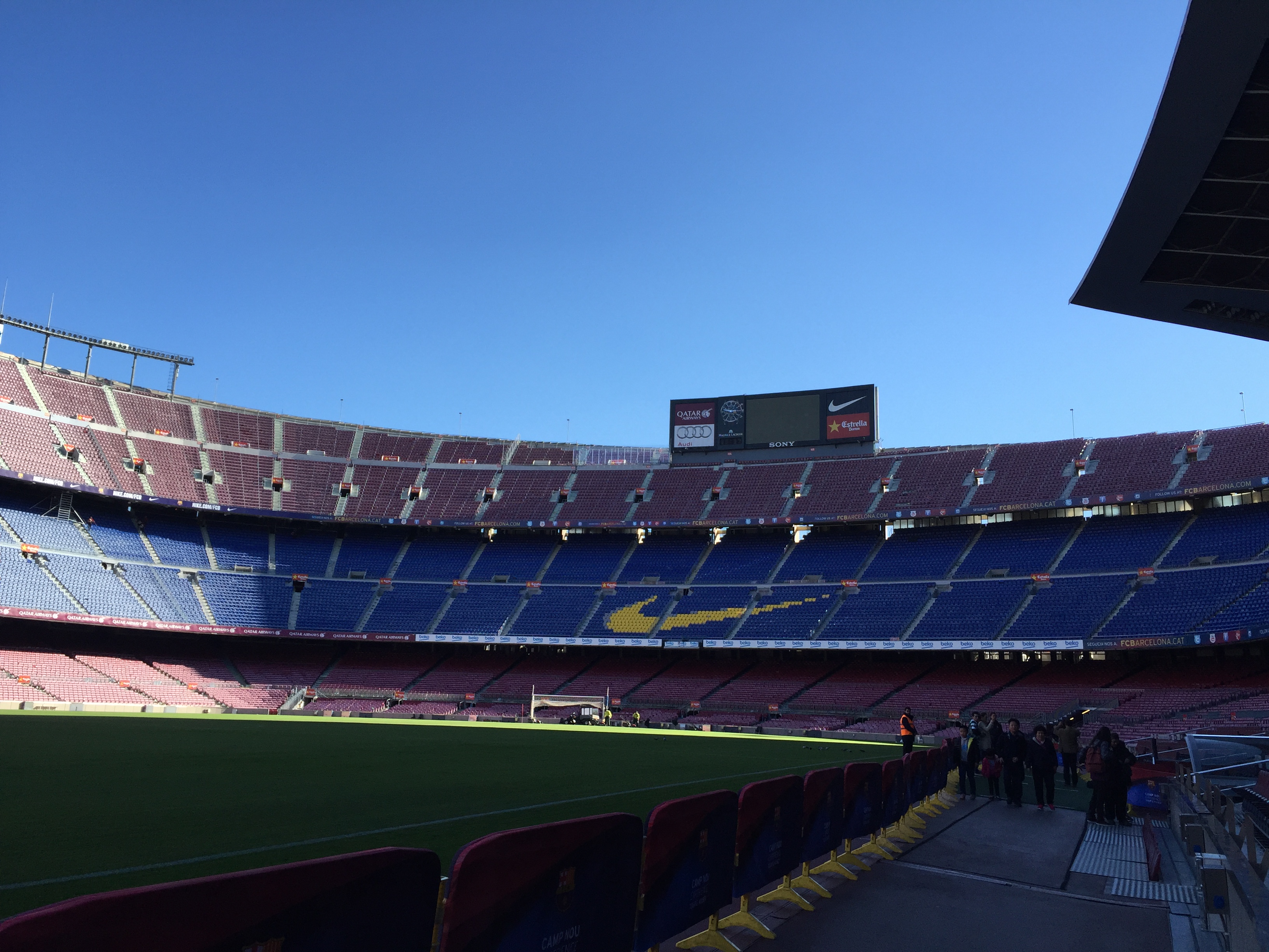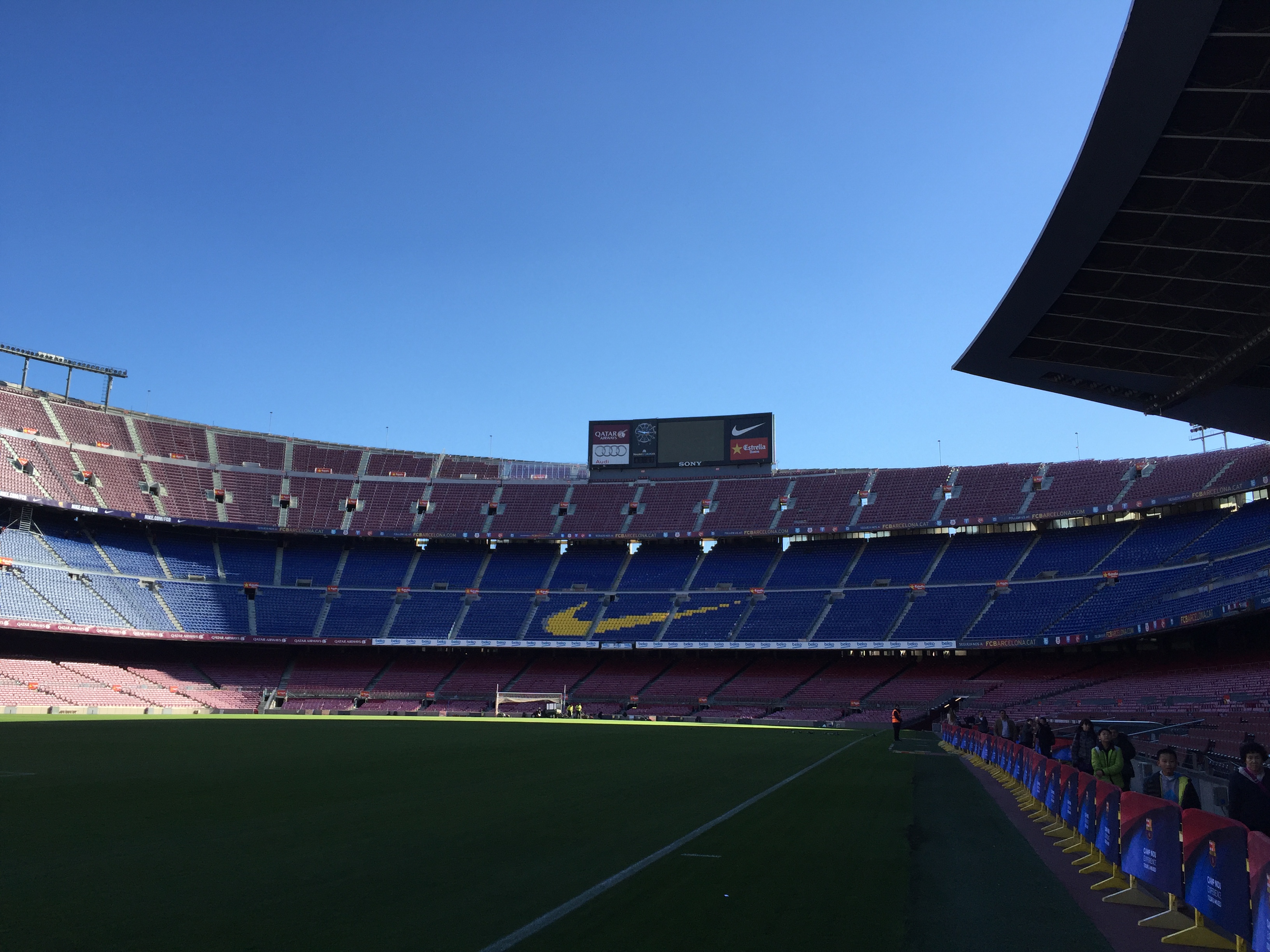 캄프누는 약 10만명을 수용할 수 있는 거대한 경기장으로 잔디를 밟으며 올려다본 경기장은