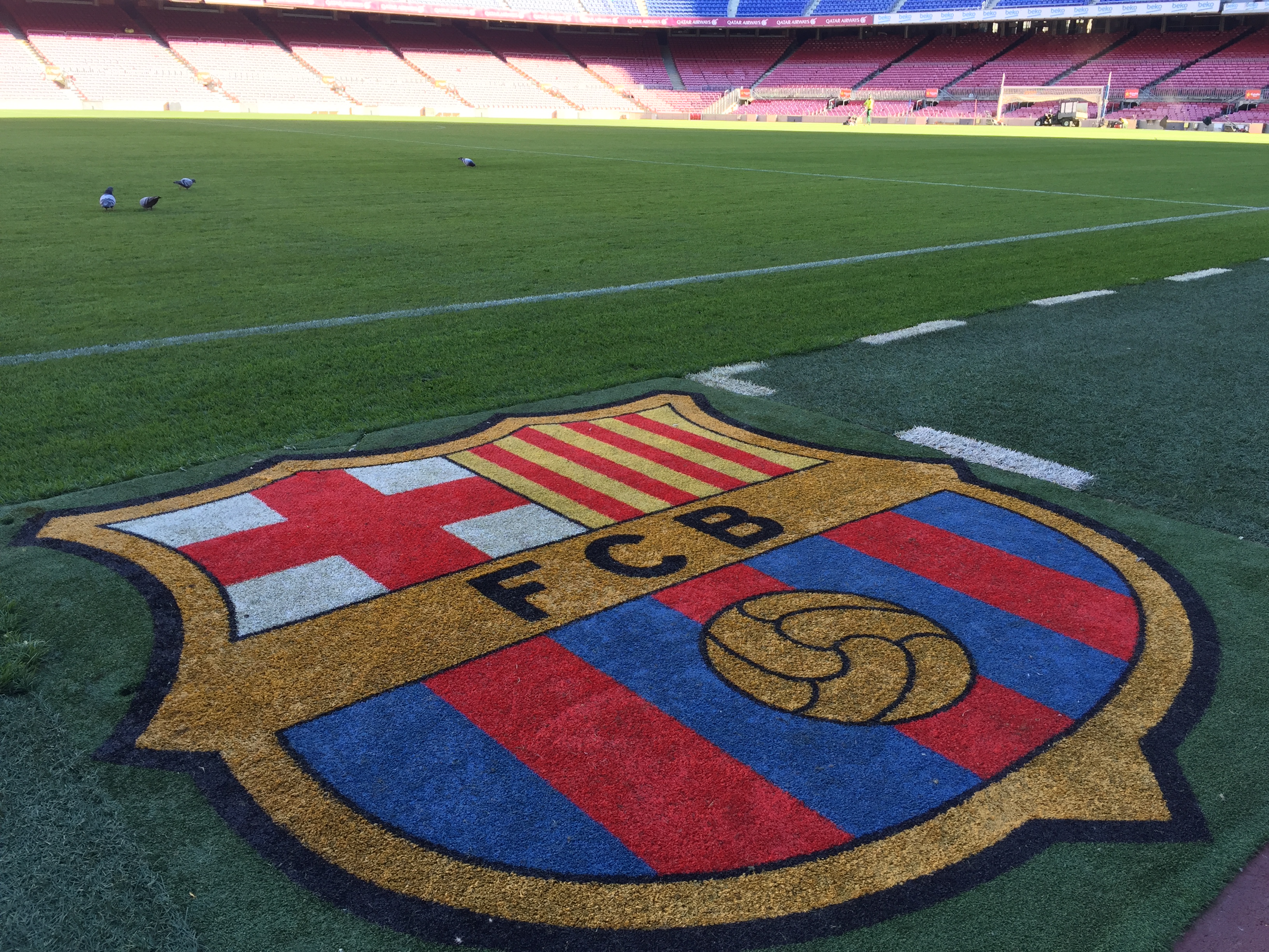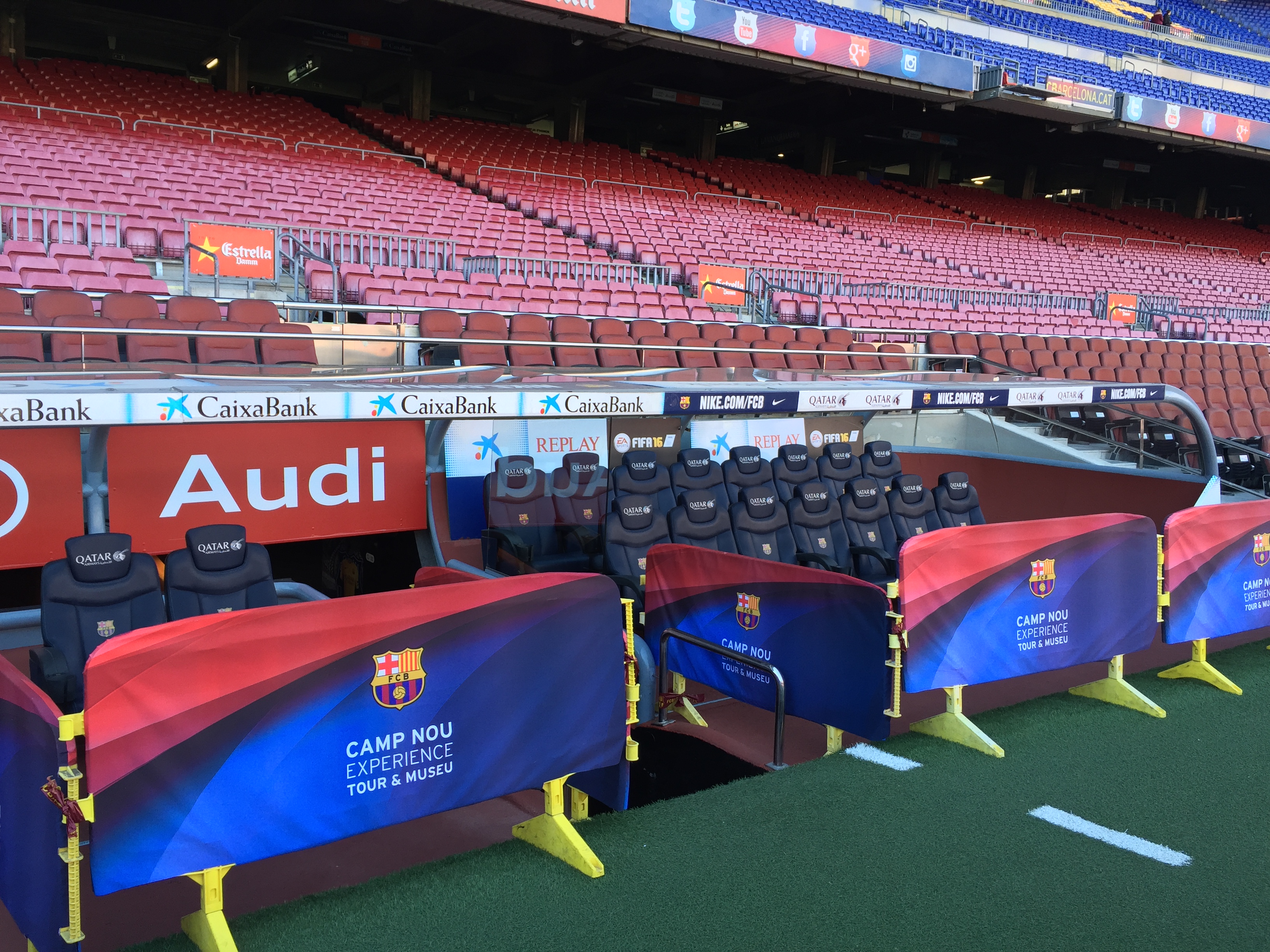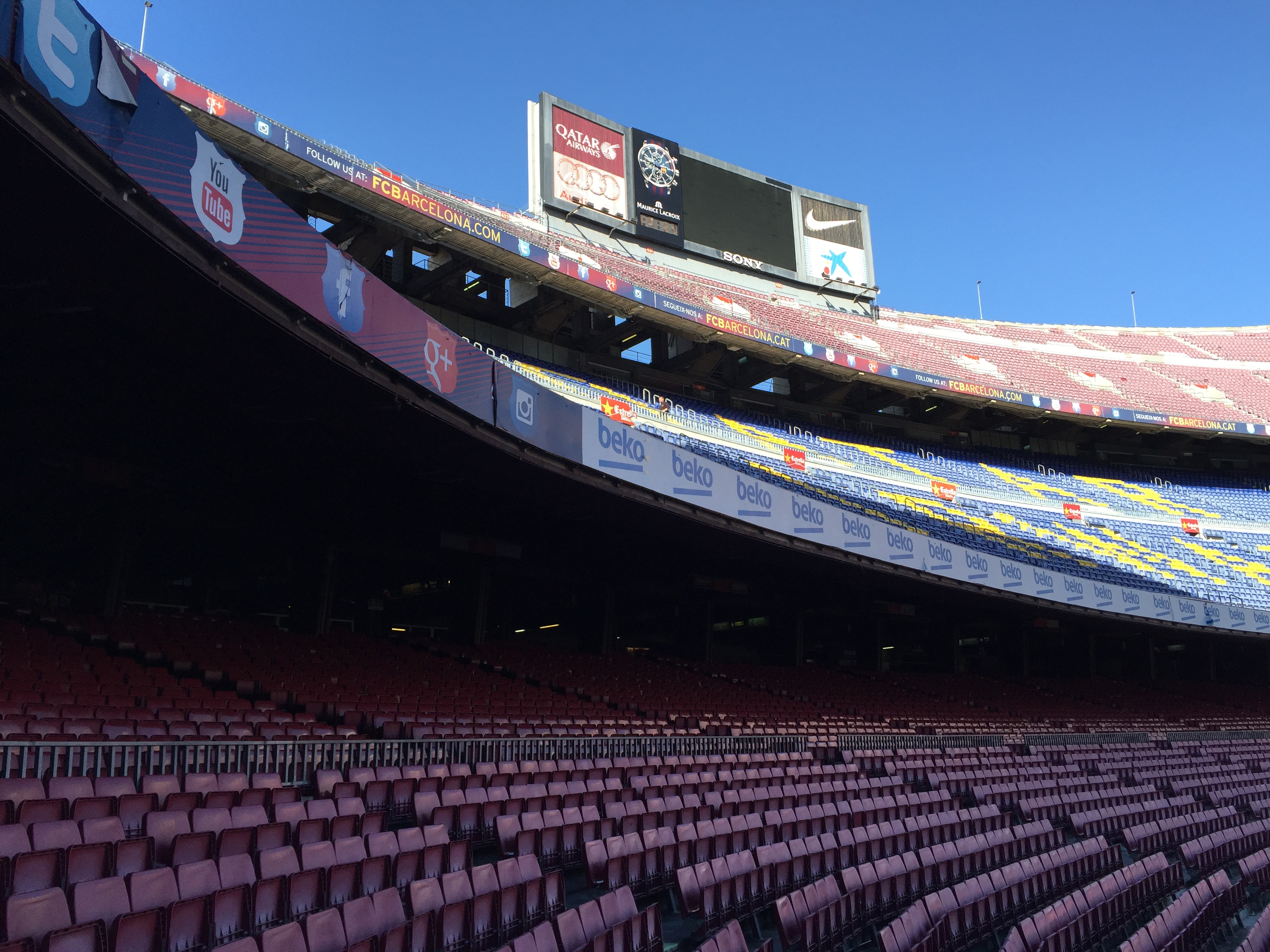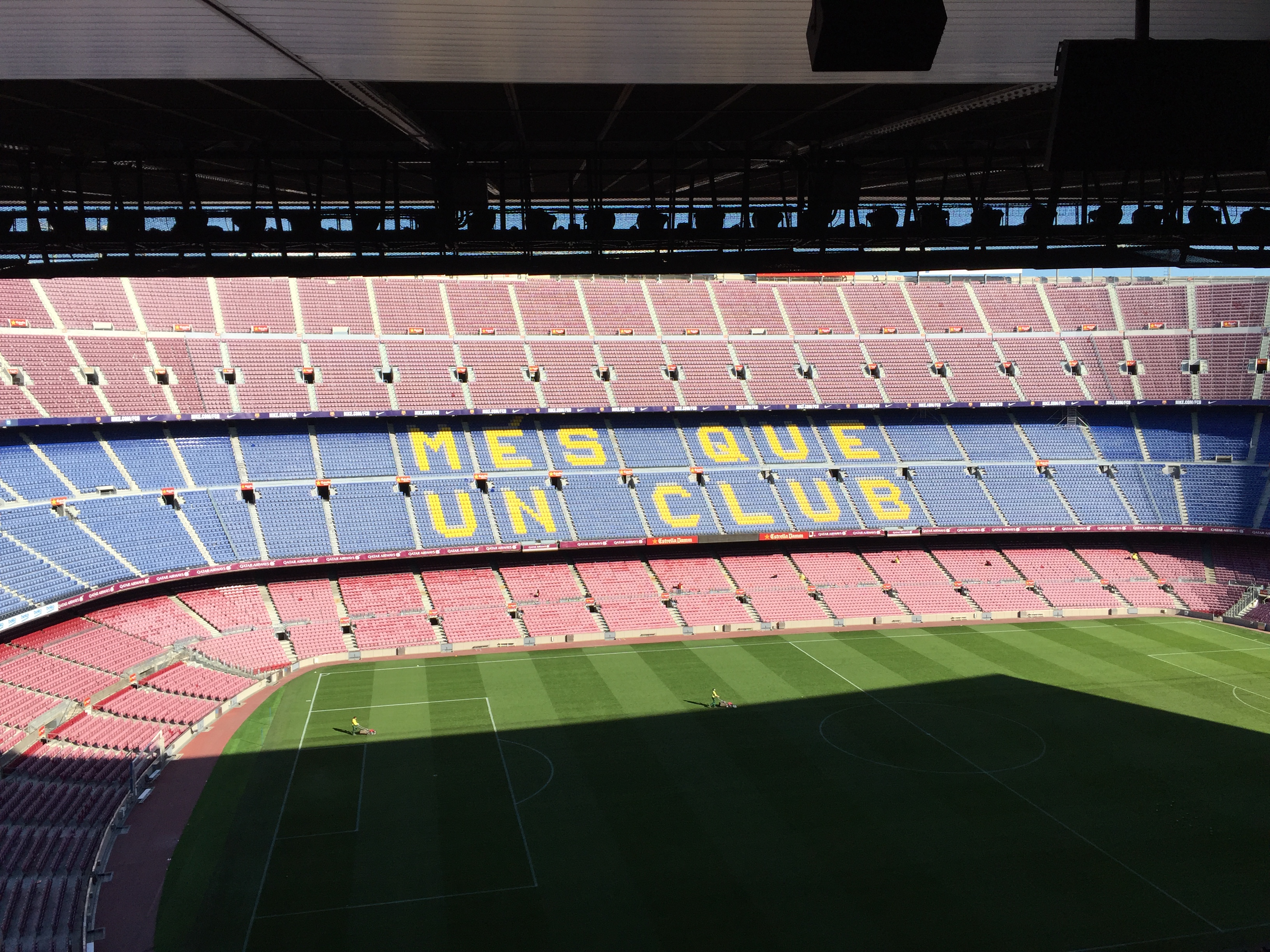 캄프누는 약 10만명을 수용할 수 있는 거대한 경기장으로 잔디를 밟으며 올려다본 경기장은