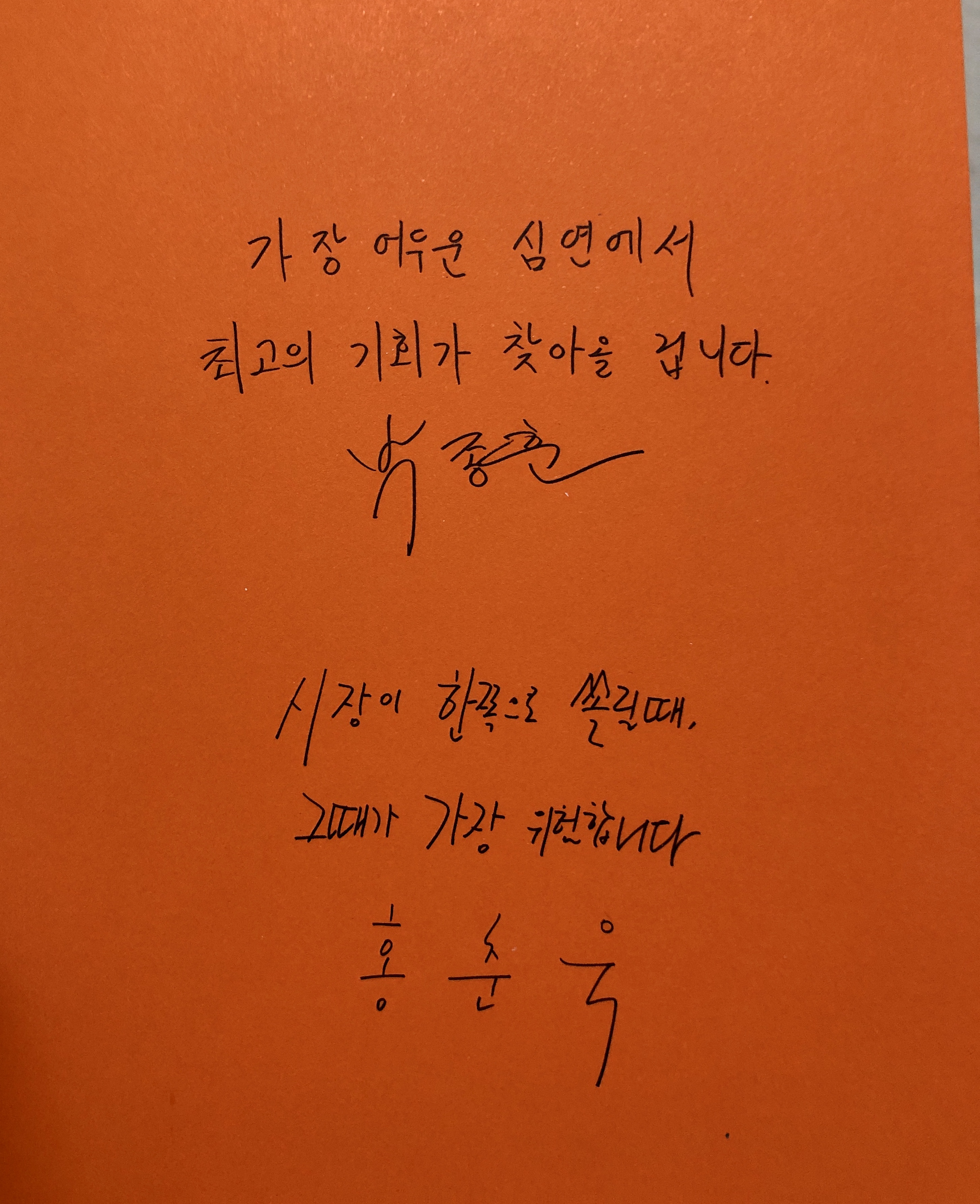 동네 도서관에서 책을 대여하였는데 책 표지 뒤에는 두 사람의 한 마디와 함께 자필 사인이 되어있었다.