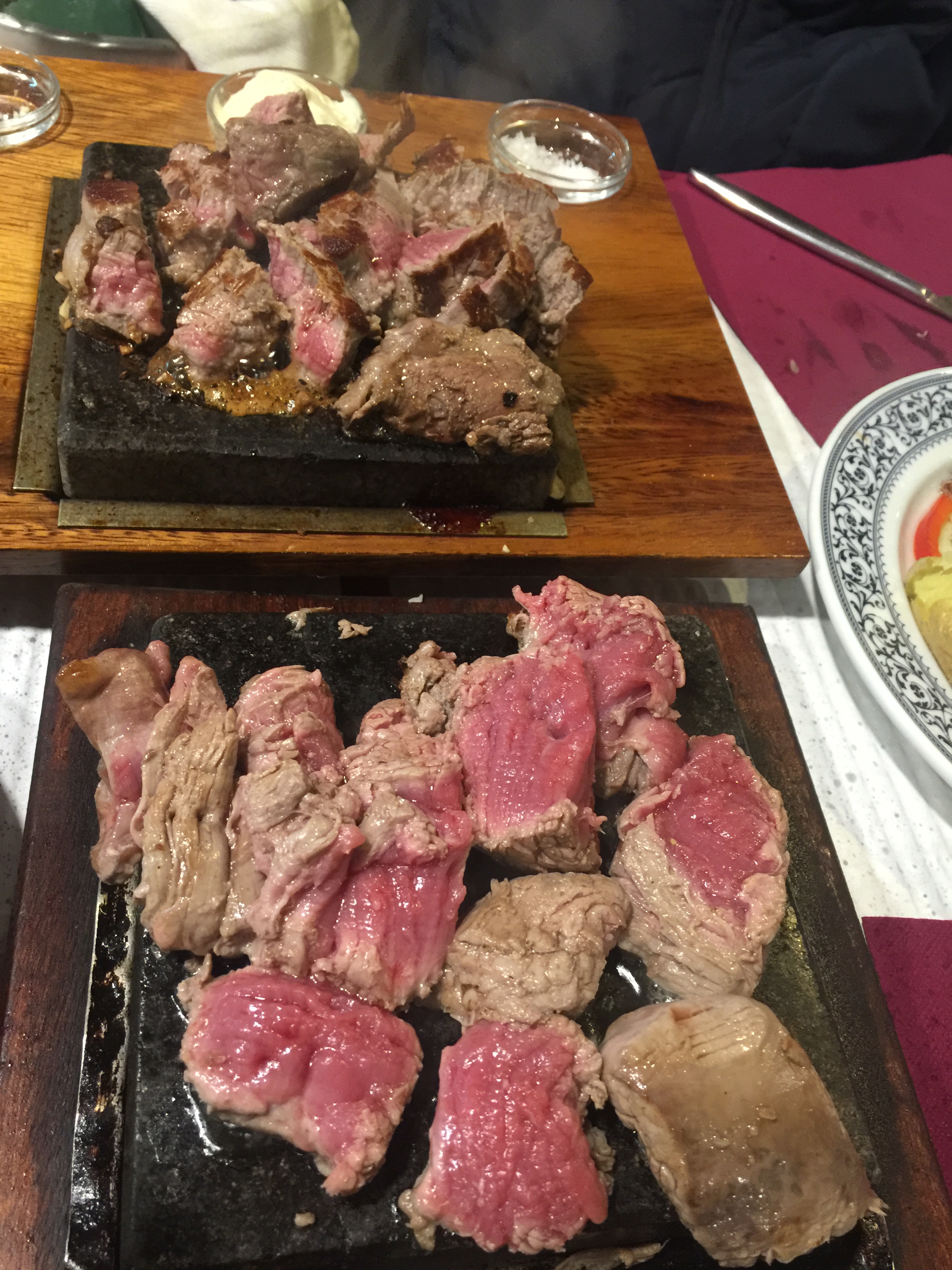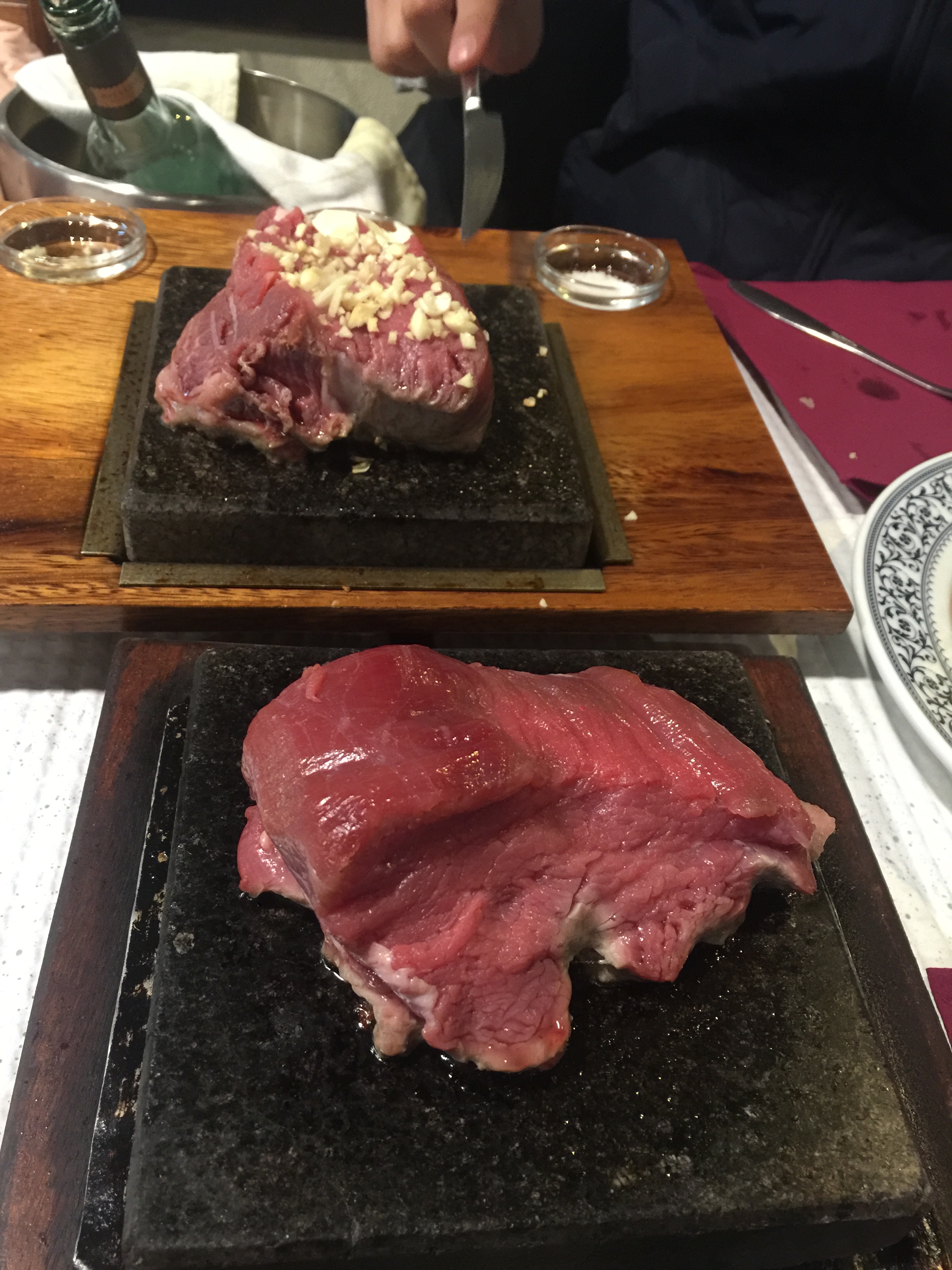 뜨거운 돌판에 치즈가 올려져서 고기가 나오는데 뜨거운 돌판에 고기가 익어 가면서