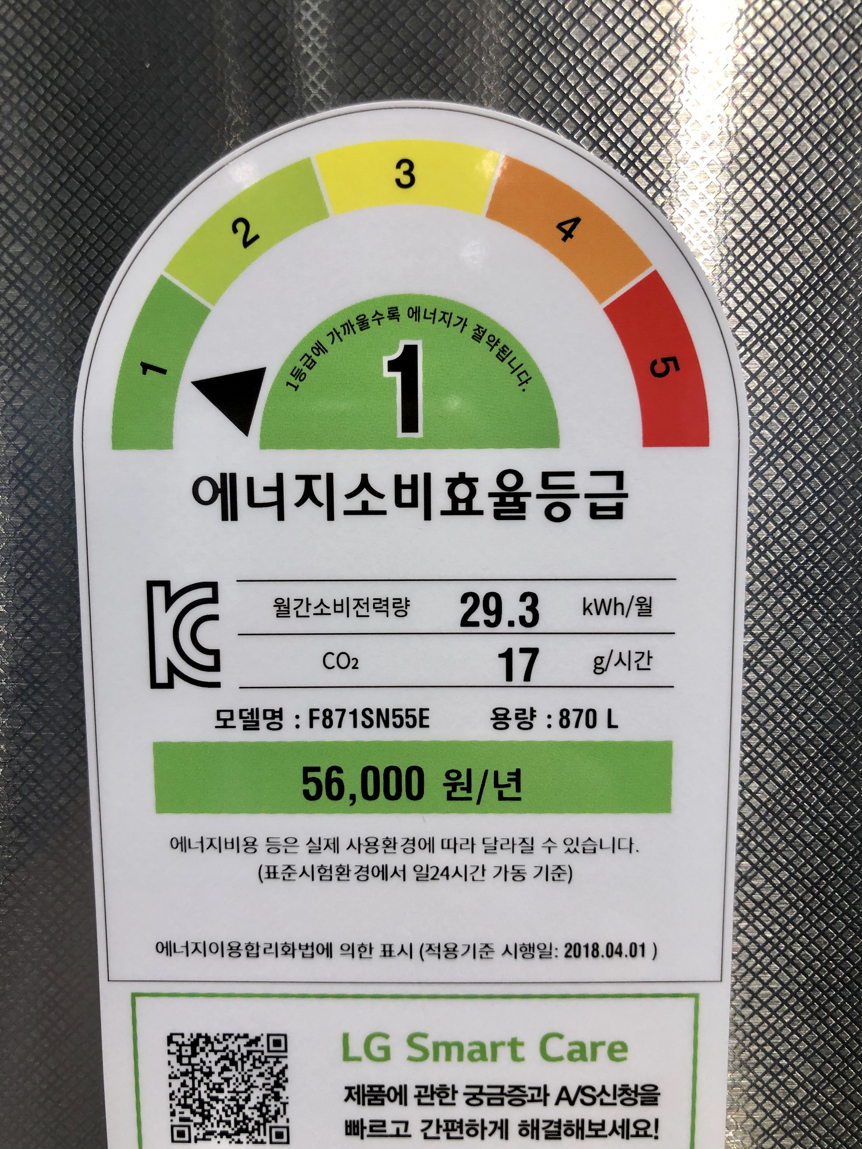 그리고 에너지 효율등급1등급으로 연간 전기료가 약 56,000원 이라고 하니 매우 경제적이었습니다.