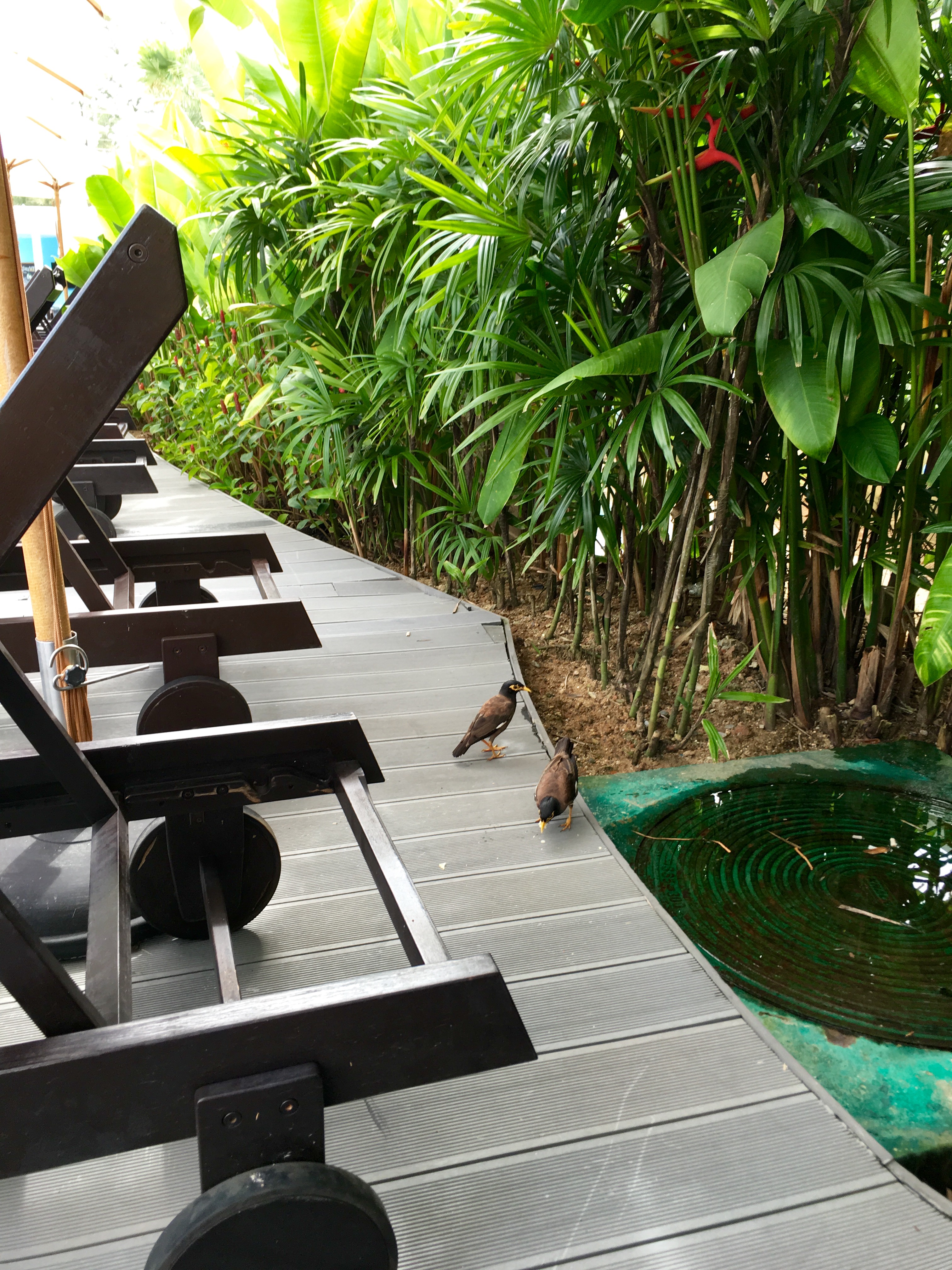 쉬다보니 선베드 뒤로 사람을 두려워 하지 않는 새들이 날아와 떨어진 음식을 주워먹고 있었다.