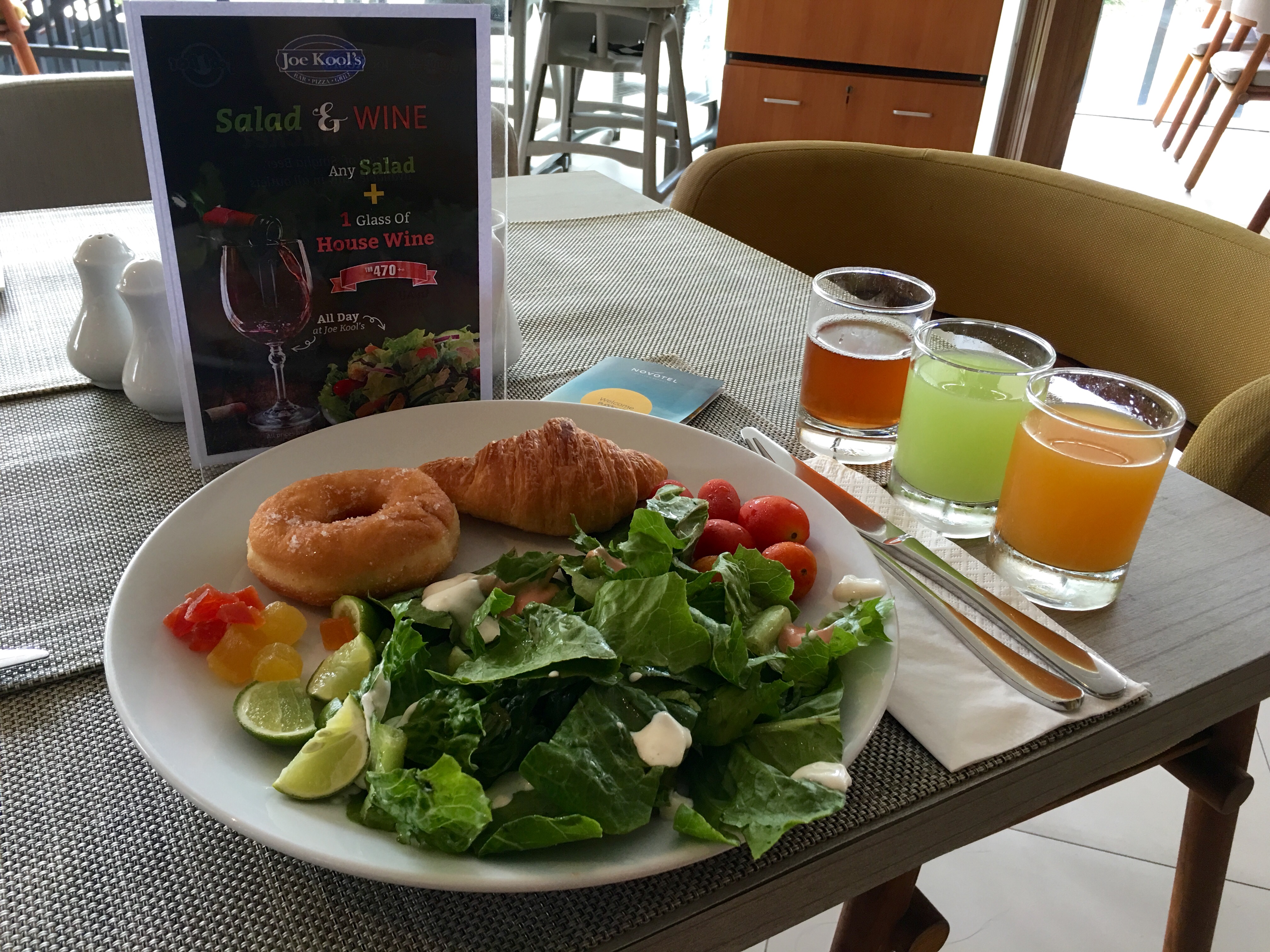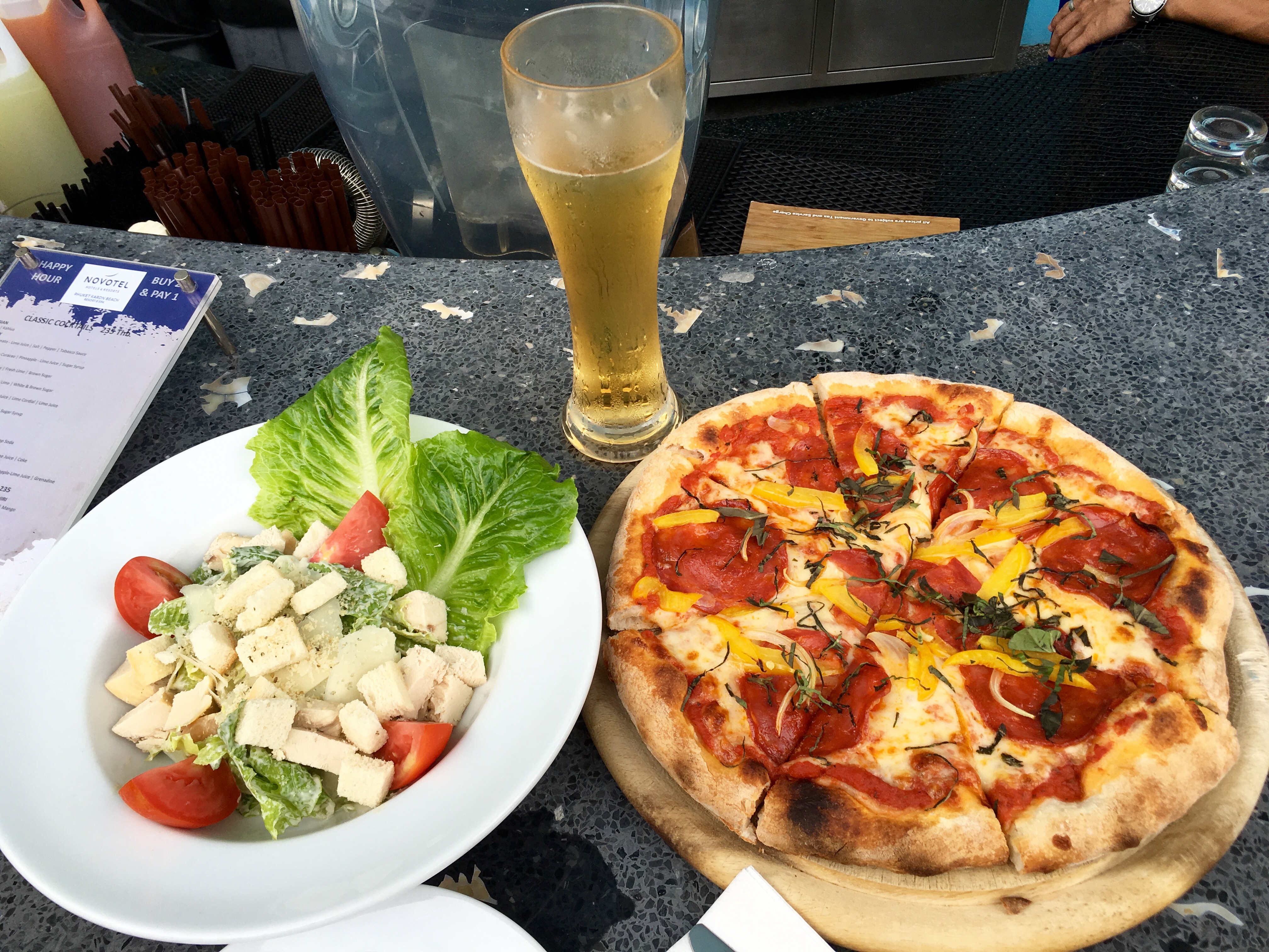 한참 수영을 하다가 지인과 수영장에 위치한 풀바에서 치킨샐러드와 피자 맥주를 즐겼다.