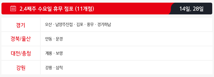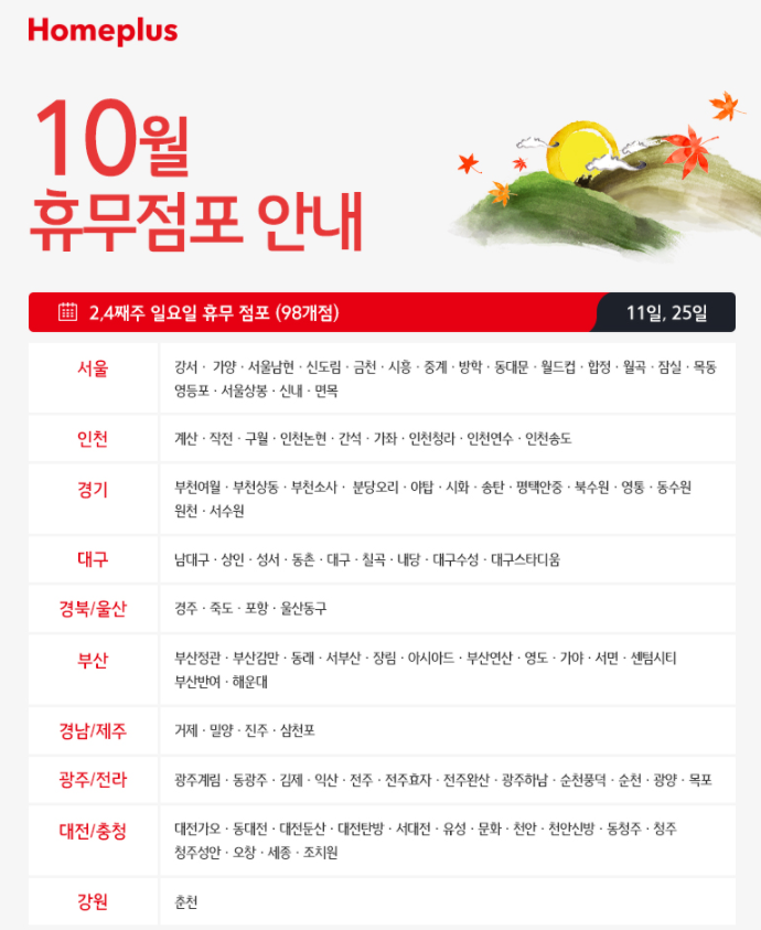두번째로 2,4째주 수요일인 10월14일과 28일에도 11개의 홈플러스점포가 휴무하게 됩니다.