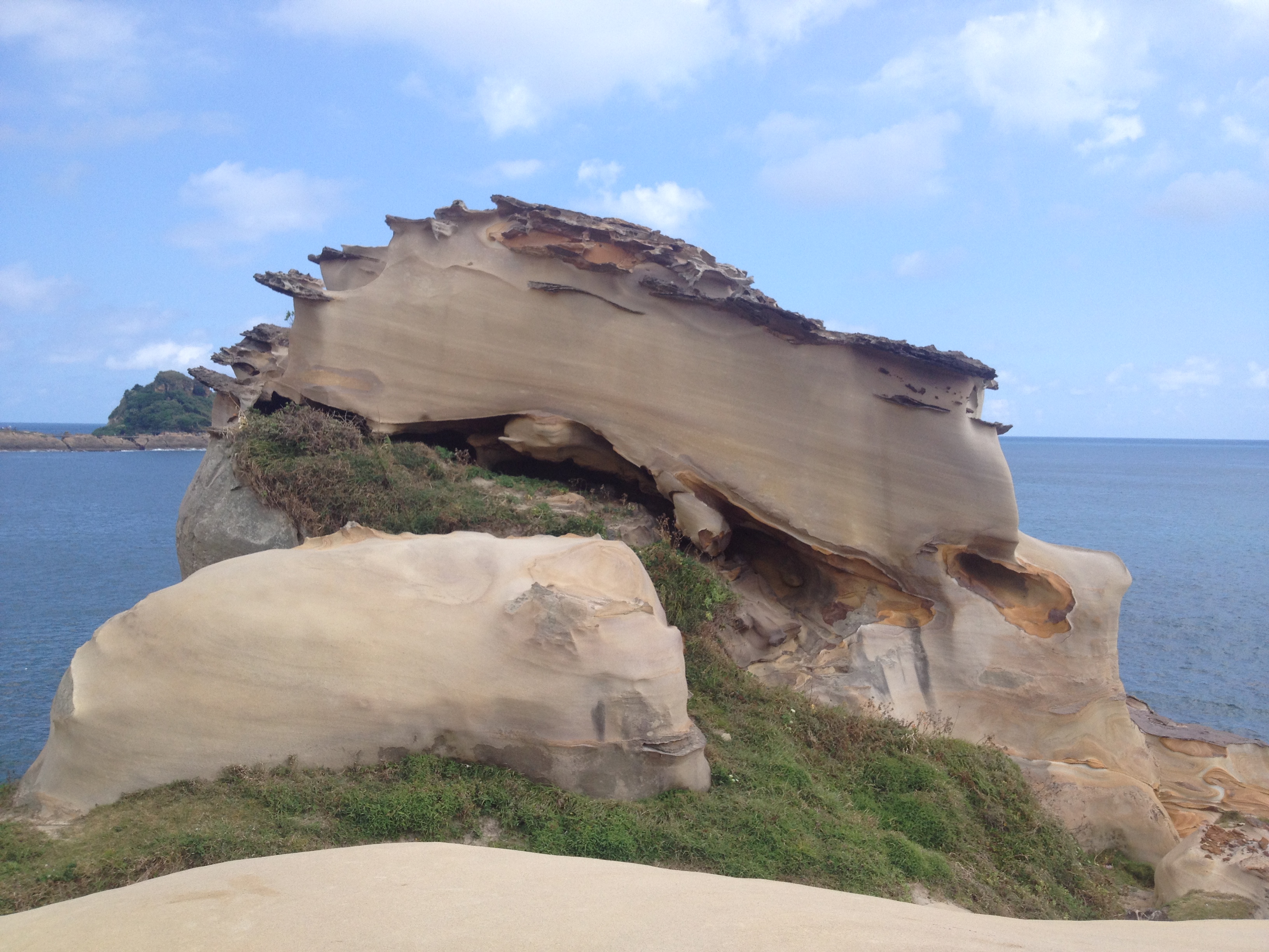 침식에 견뎌내고 아랫쪽의 암층이 바닷바람 등의 요인으로 침식하여 만들어지는 버섯바위,
