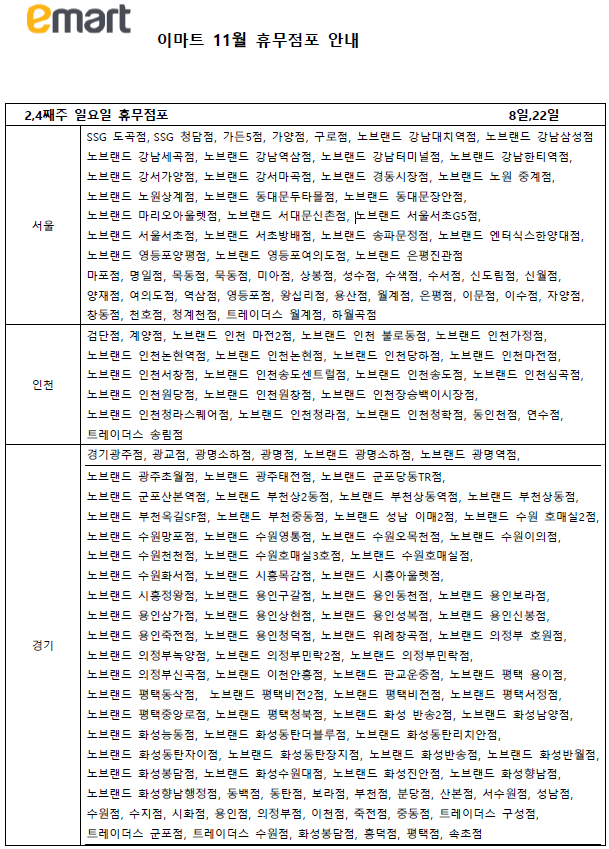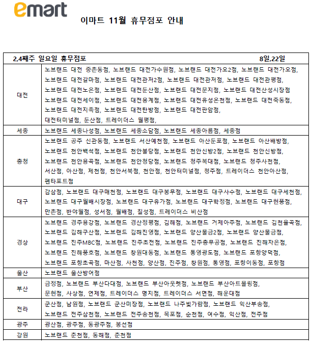 마지막으로 11월 이마트 기타요일 휴무 점포들입니다.