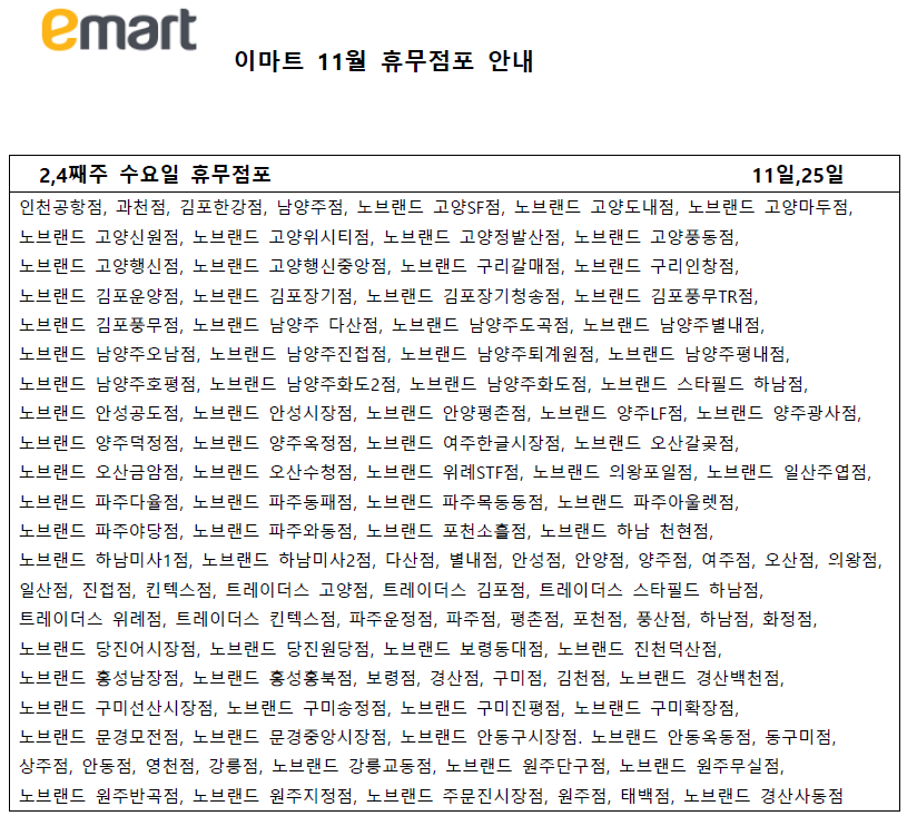 마지막으로 11월 이마트 기타요일 휴무 점포들입니다.