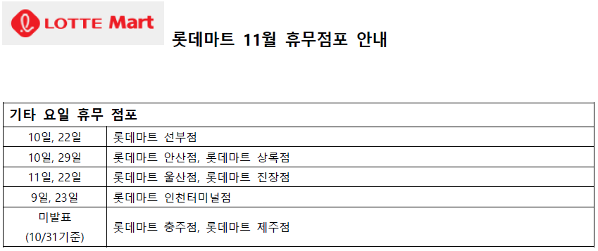 롯데마트 충주점과 롯데마트 제주점은 10/31일 기준 아직 휴무점을 발표하지 않았습니다.