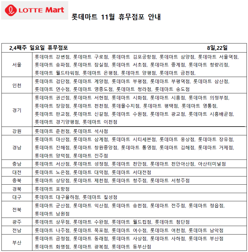 대부분의 롯데마트 점포는 2,4째주 일요일인 11월 8일과 22일에 휴무합니다.