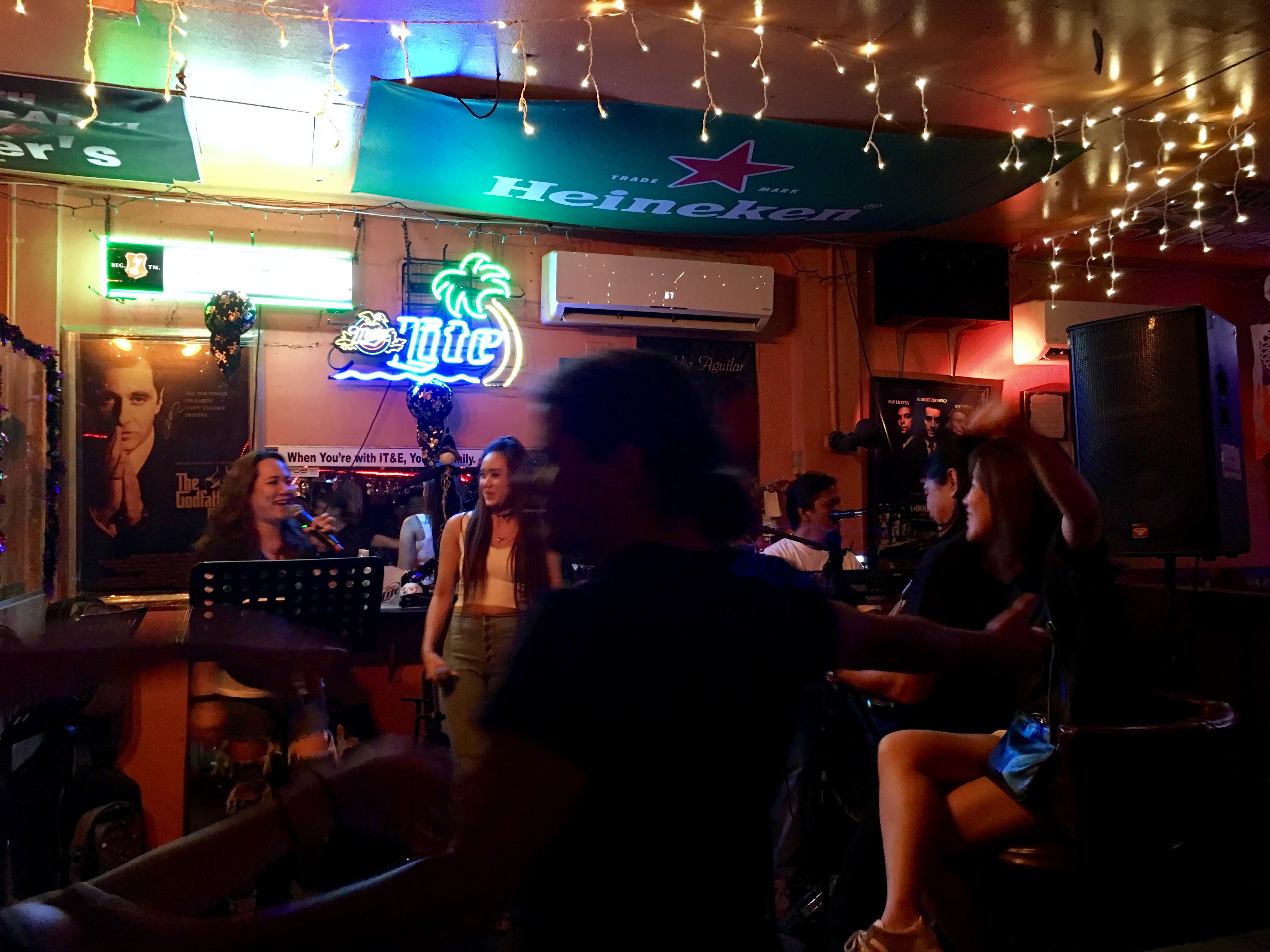 공연팀이 있는 라이브바로 연주와 노래를 동시에 하는 가수팀이 공연을 하고 흥에겨운 사람들이