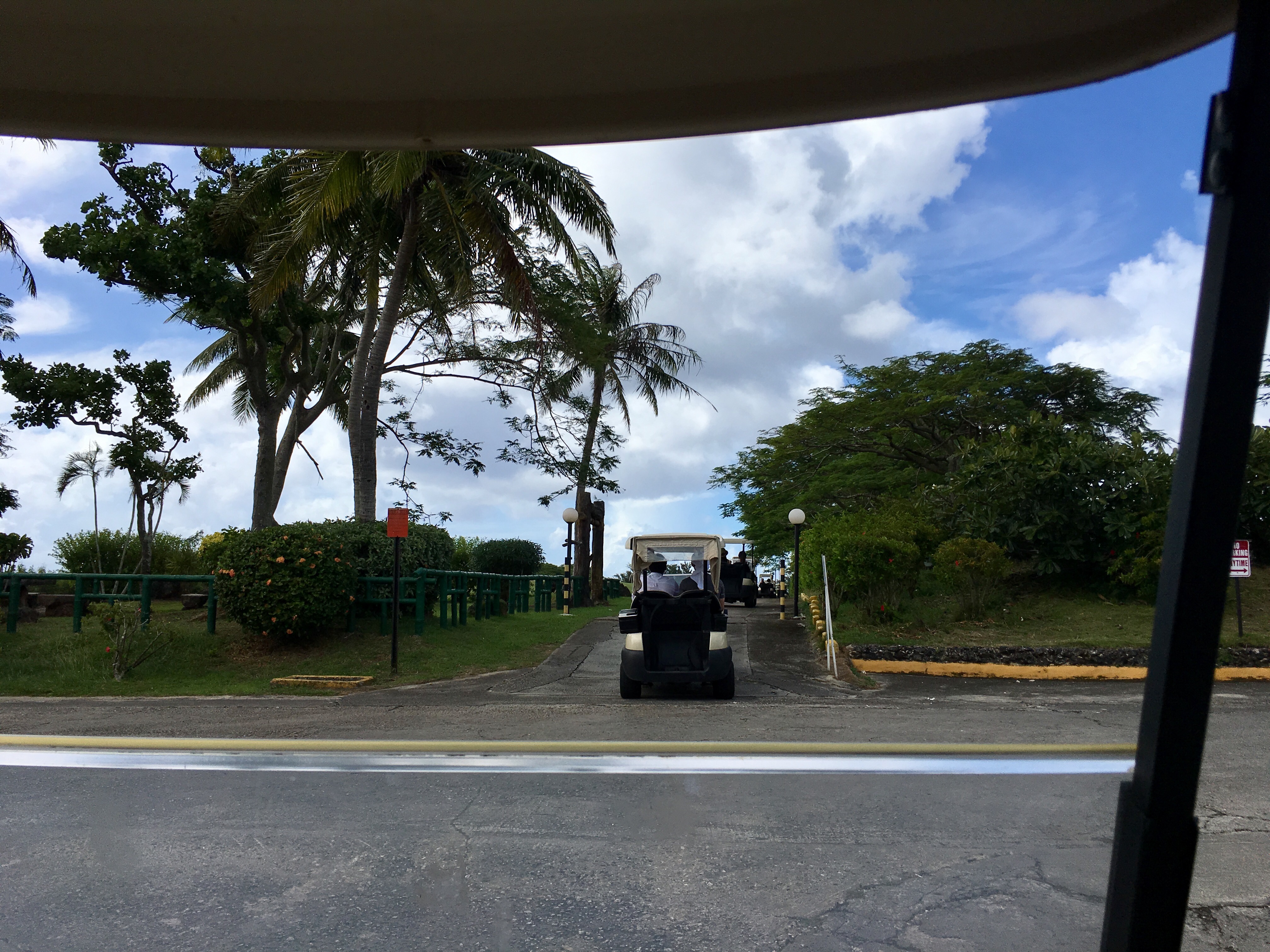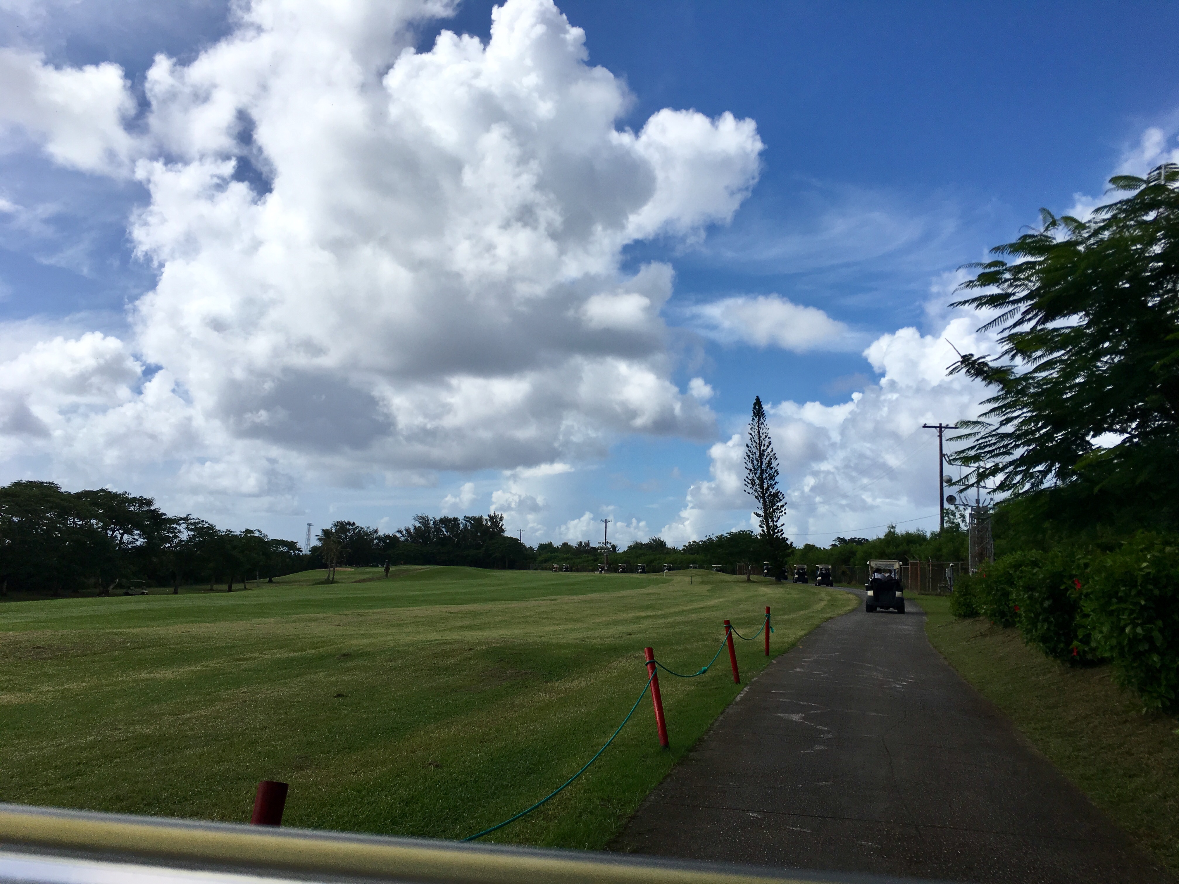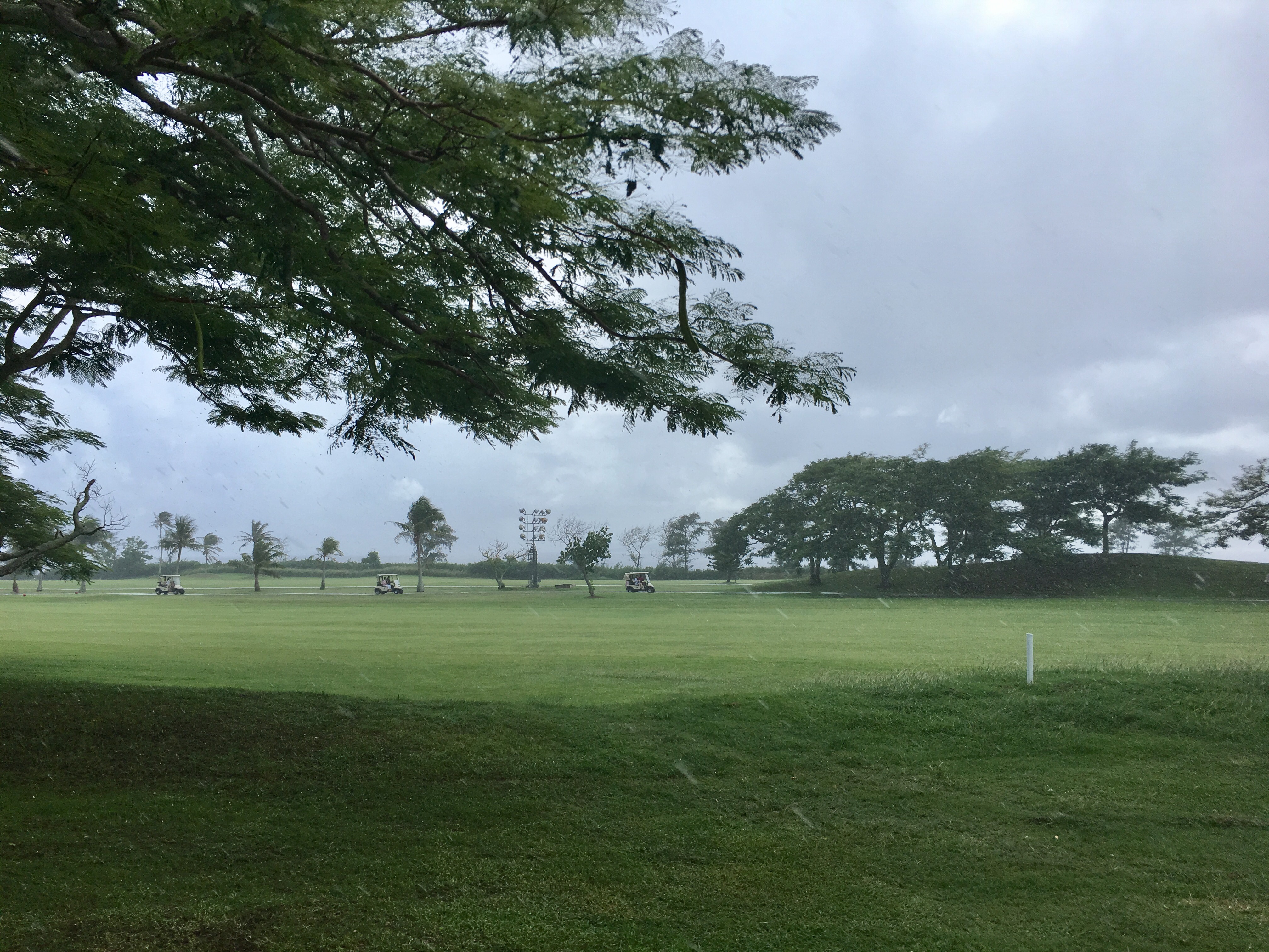 카트를 타고 골프장 진입을 하는데, 맑기만 하던 하늘에서 별안간 천둥번개를 동반한 폭우가 쏟아진다.