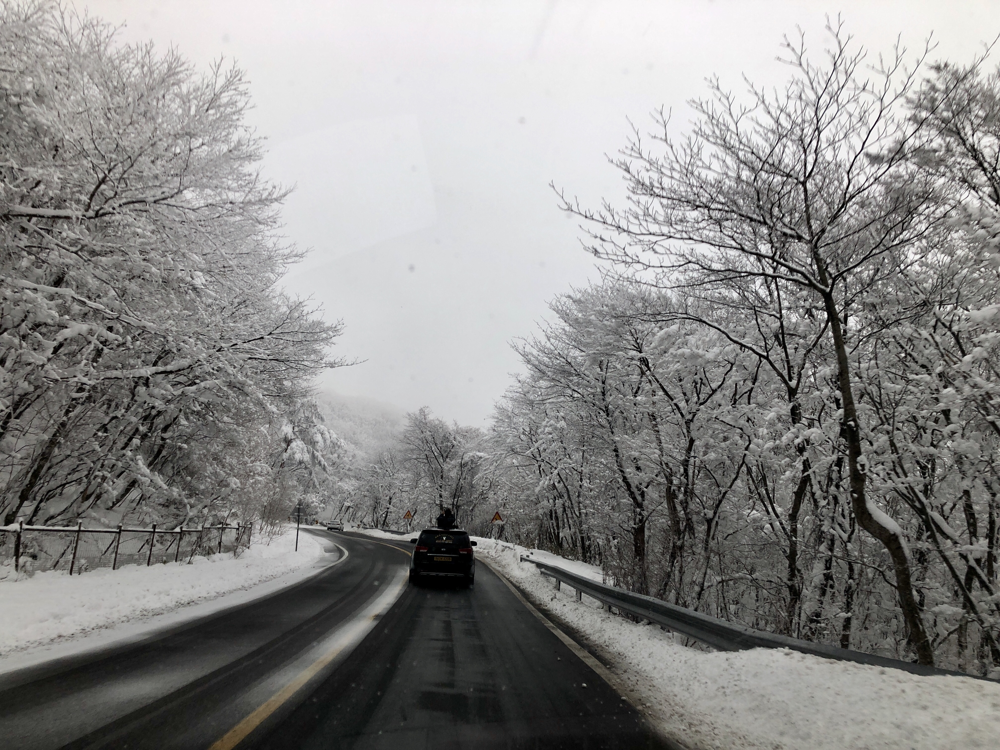 그런데 차로 조금씩 올라가다보니 전망대가 나타나고 전망대 옆 산비탈길로 눈이 보이기 시작하며