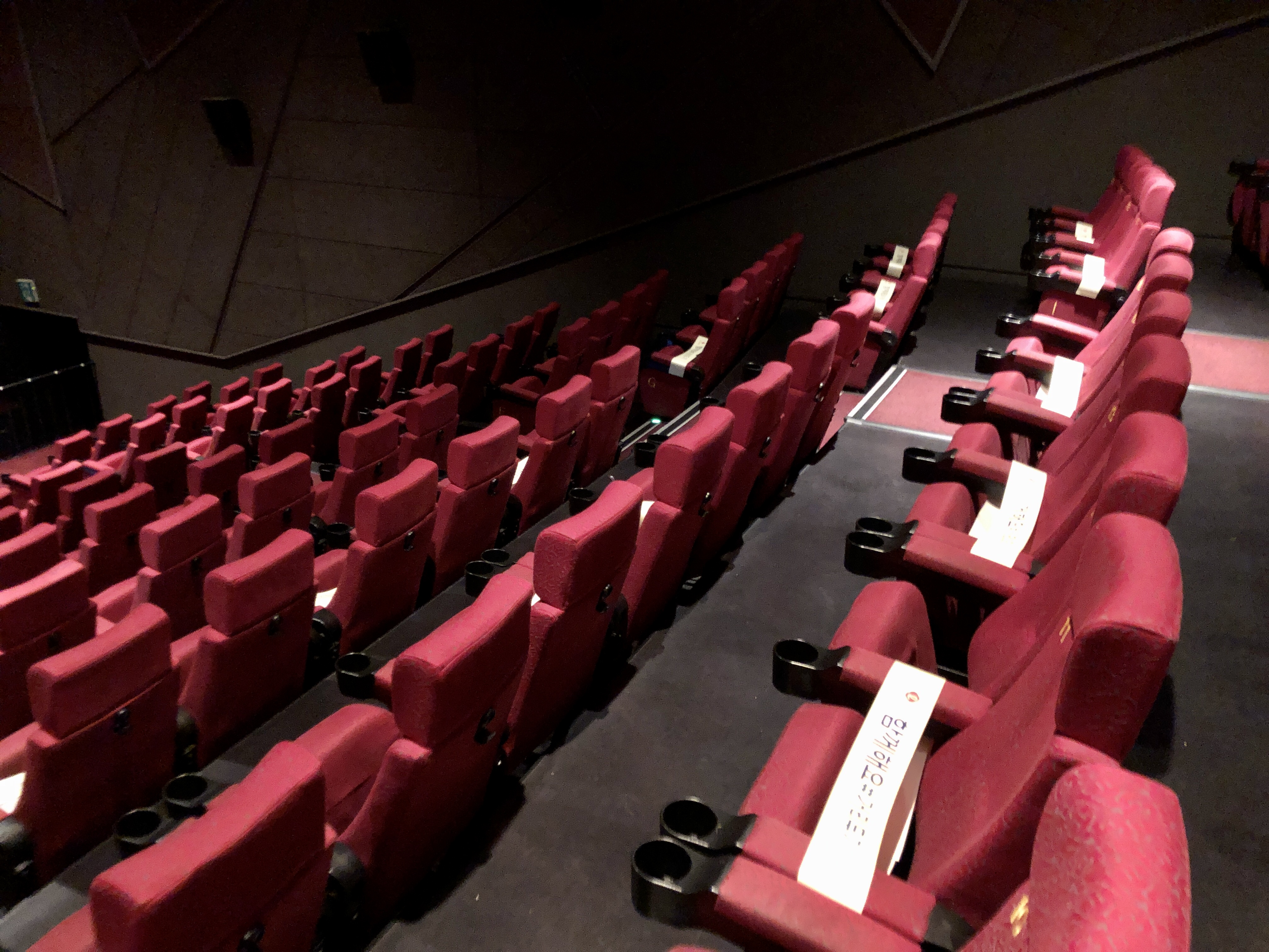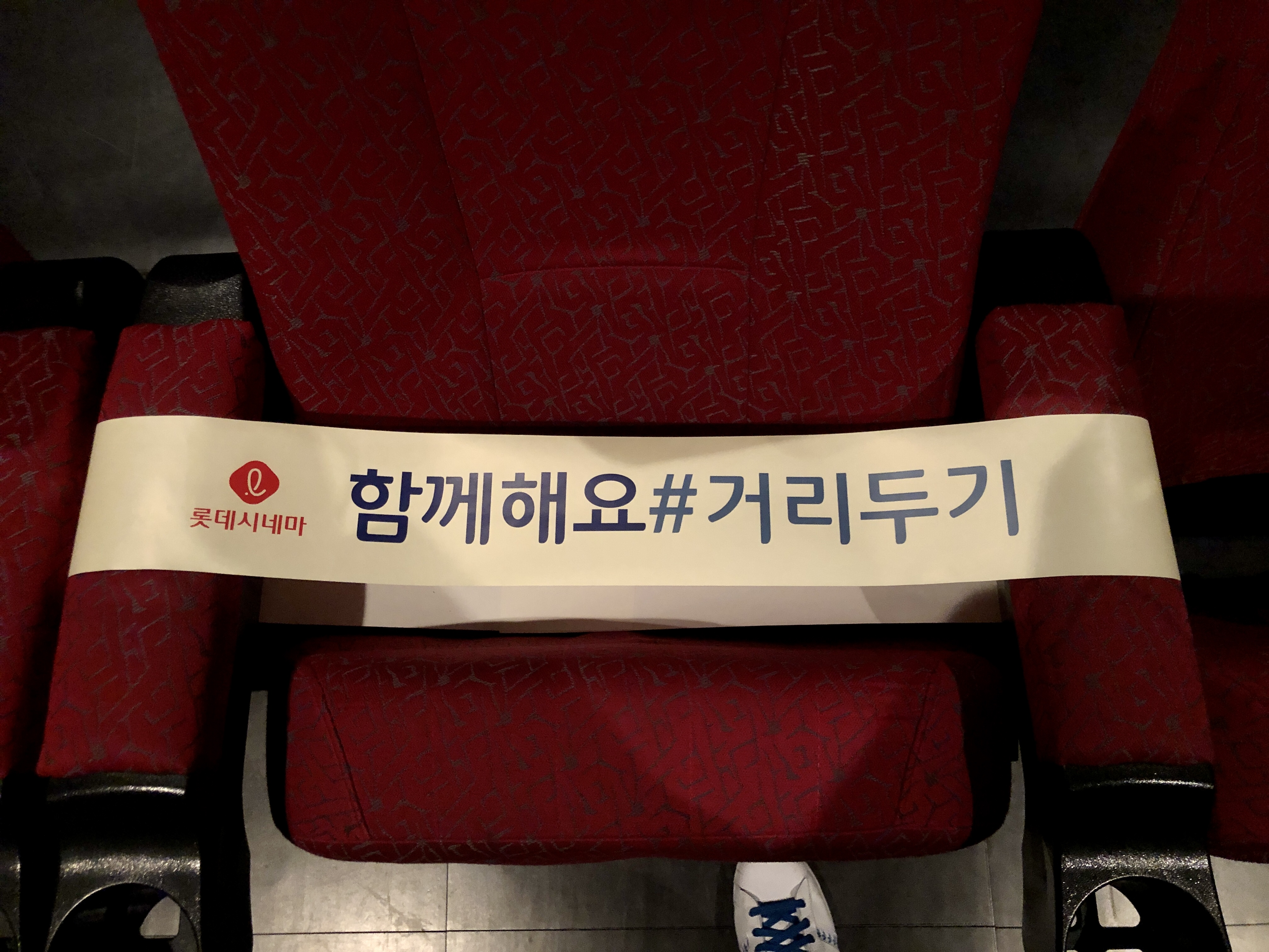 영화관은 연석으로 앉지 못하게 의자에 거리두기 표시를 해 두었습니다.