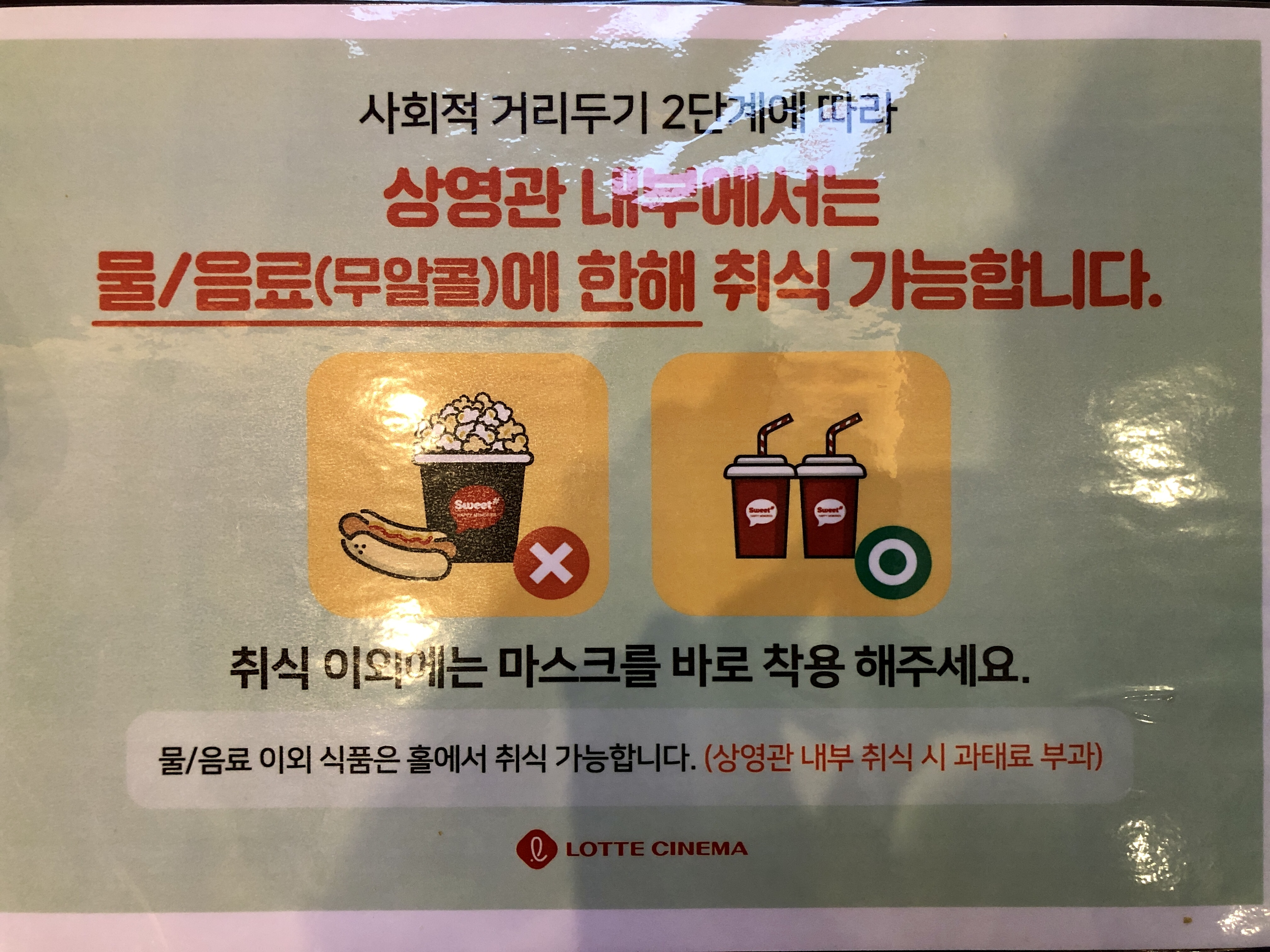 그리고 사회적 거리두기 2단계에 따라 상영관 내에서는 물이나 음료(무알콜만 가능)만