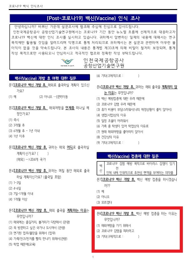 인천공항공사의 보도자료에 따르면 코로나19 백신 개발 이후 예방 접종 의향을 묻는 질문에