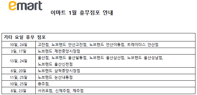 마지막으로 1월 이마트 기타요일 휴무 점포들입니다.