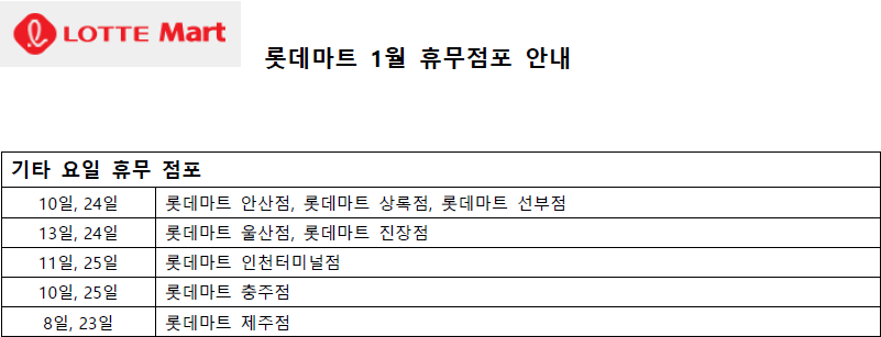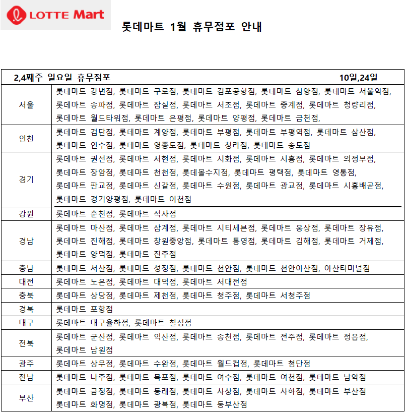 대부분의 롯데마트 점포는 2,4째주 일요일인 1월 10일과 24일에 휴무합니다.