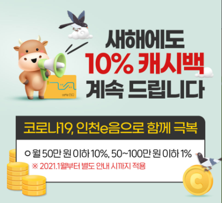 인천e음카드의 10% 캐시백 혜택이 2021년 새해에도 이어진다고 합니다.