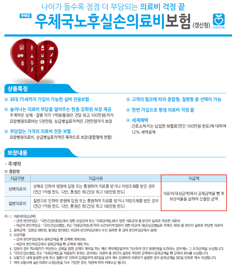 우체국 노후실손의료비보험 가입요건으로는 최초계약은 61세~75세여야 하고 갱신계약은 62세부터
