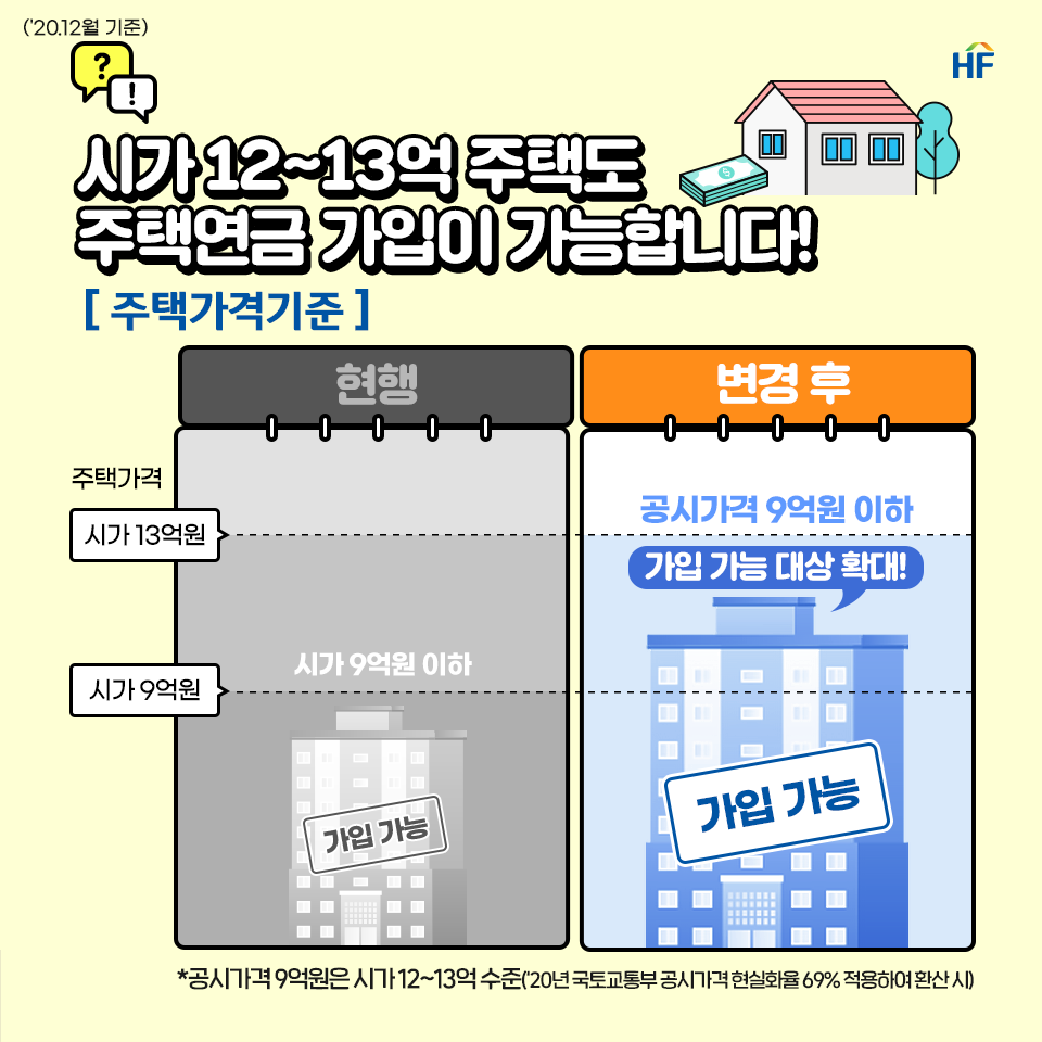 1) 시가 12~13억의 주택도 주택연금 가입가능 (이전에는 시가 9억원 이하만 가입가능)
