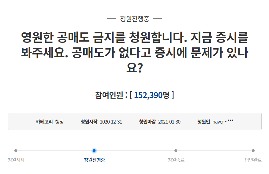 그 중 가장 많은 참여인원을 기록하고 있는 청원은 영원히 공매도를 없애달라는 청원으로