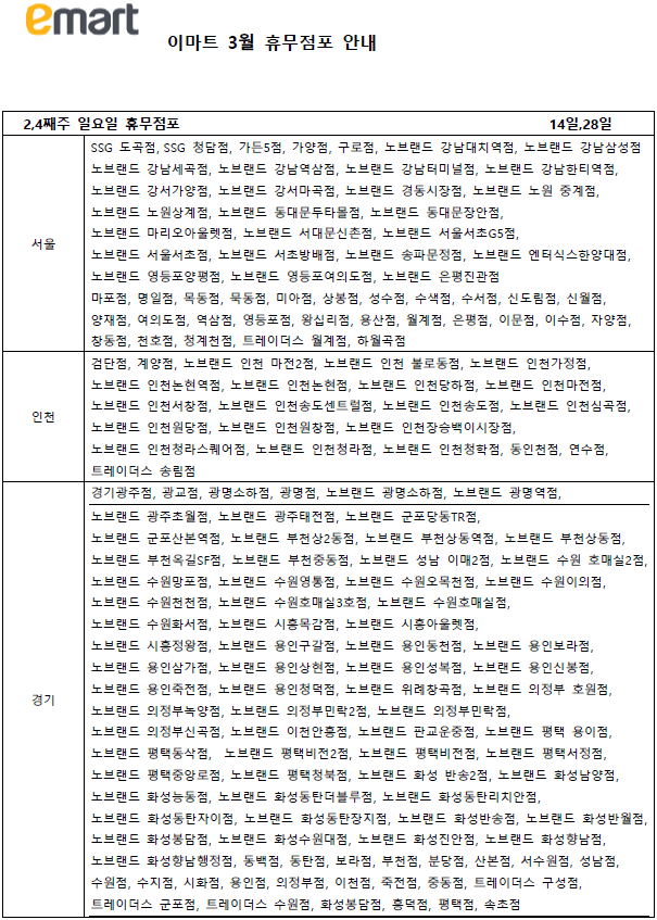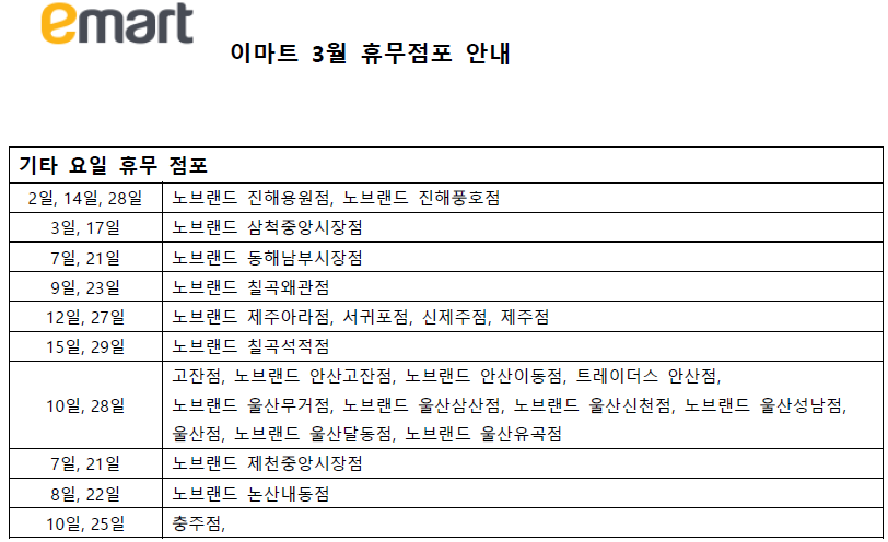 마지막으로 3월 이마트 기타요일 휴무 점포들입니다.