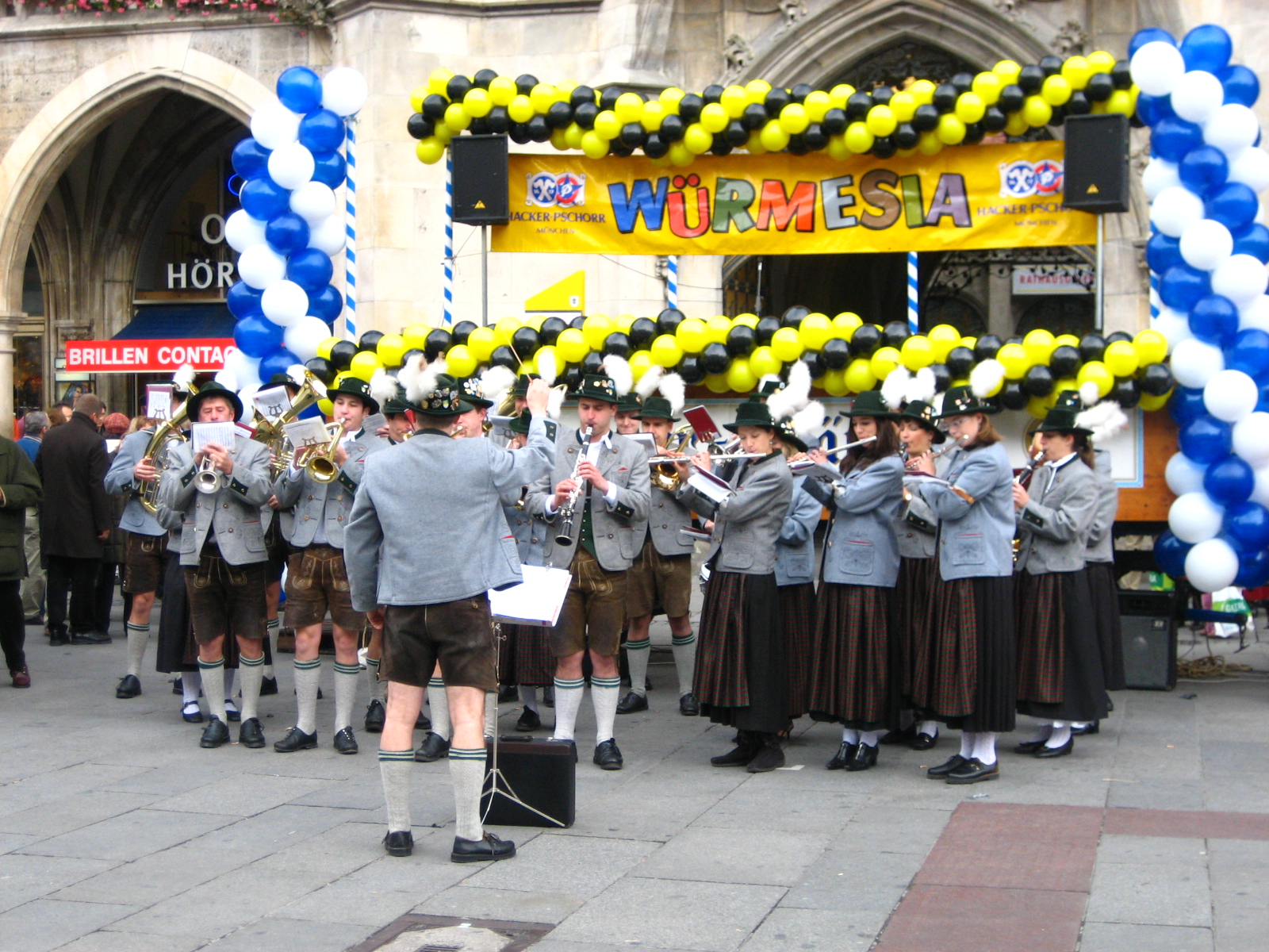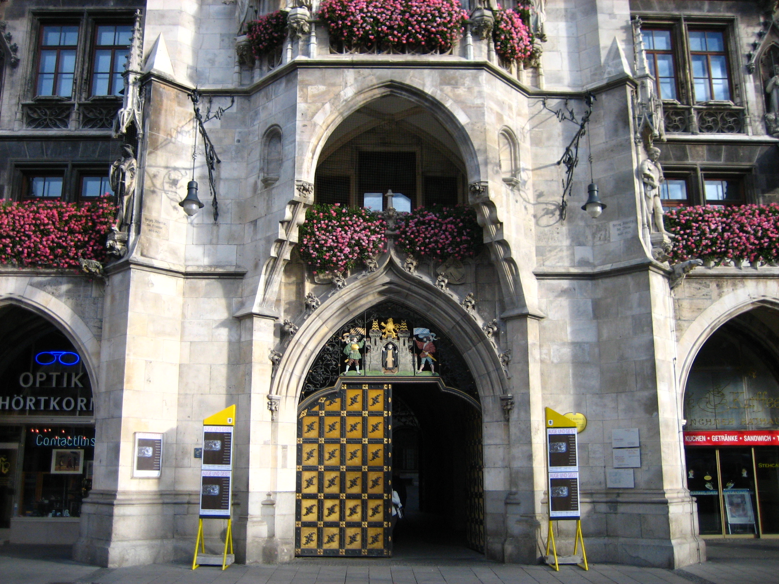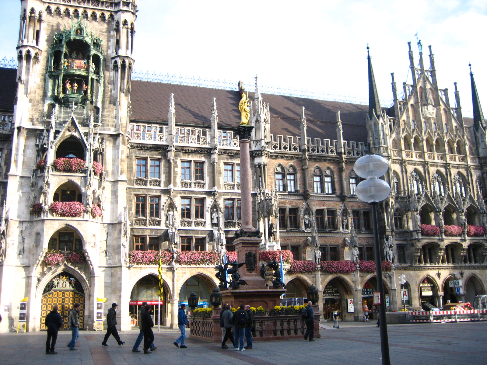 시청 건물의 앞에는 마리엔 광장(Marienplatz)이 있으며 건물의 가운데에 있는 시계탑 위에 오르면