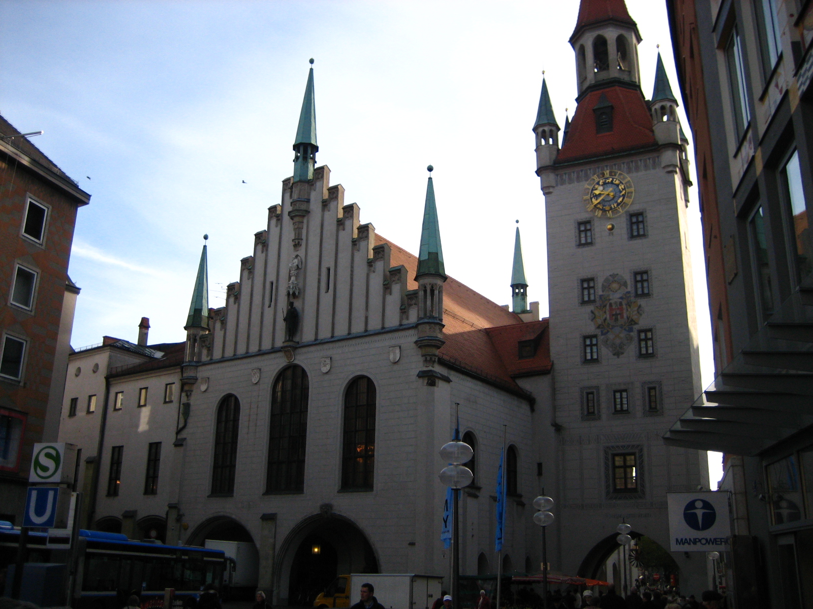 시청 건물의 앞에는 마리엔 광장(Marienplatz)이 있으며 건물의 가운데에 있는 시계탑 위에 오르면