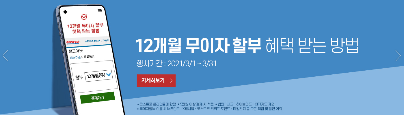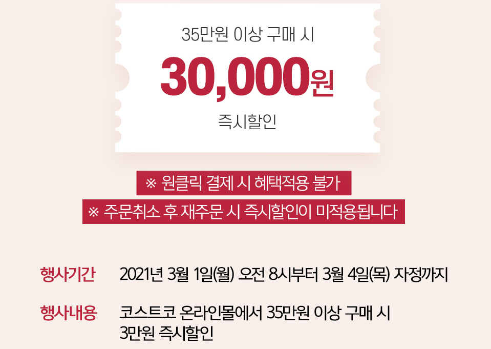 - 행사내용 : 코스트코 온라인몰에서 35만원 이상 구매 시 3만원 즉시할인