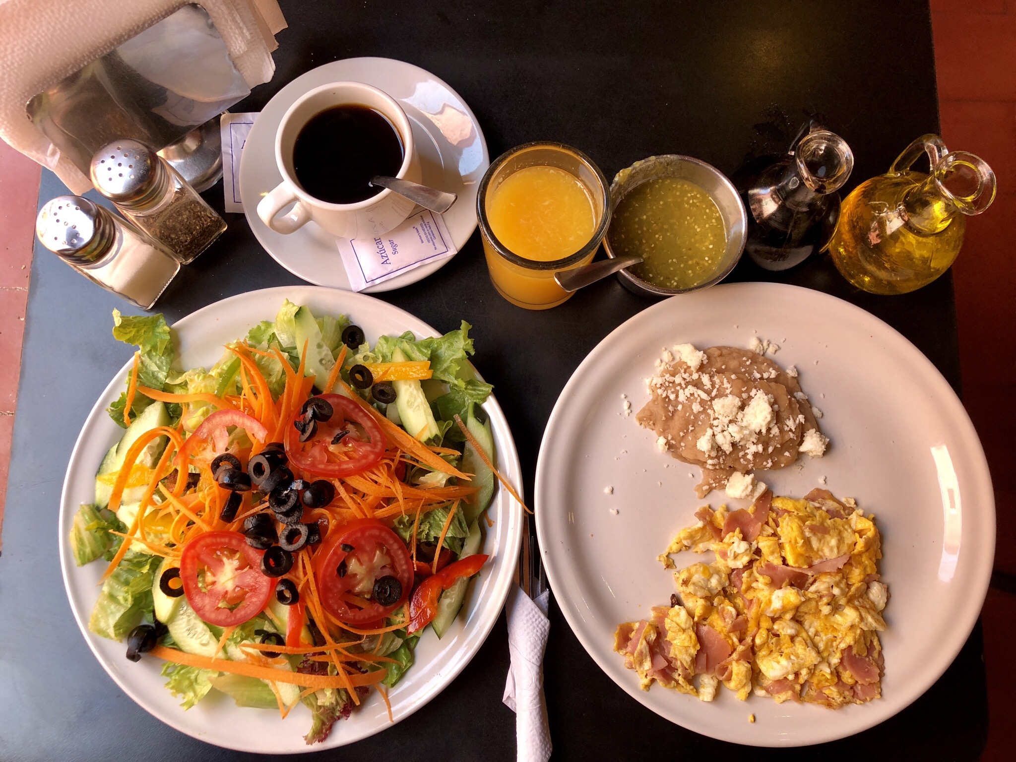신선한 샐러드와 스크럼블에그와 커피와 쥬스를 주문했다.