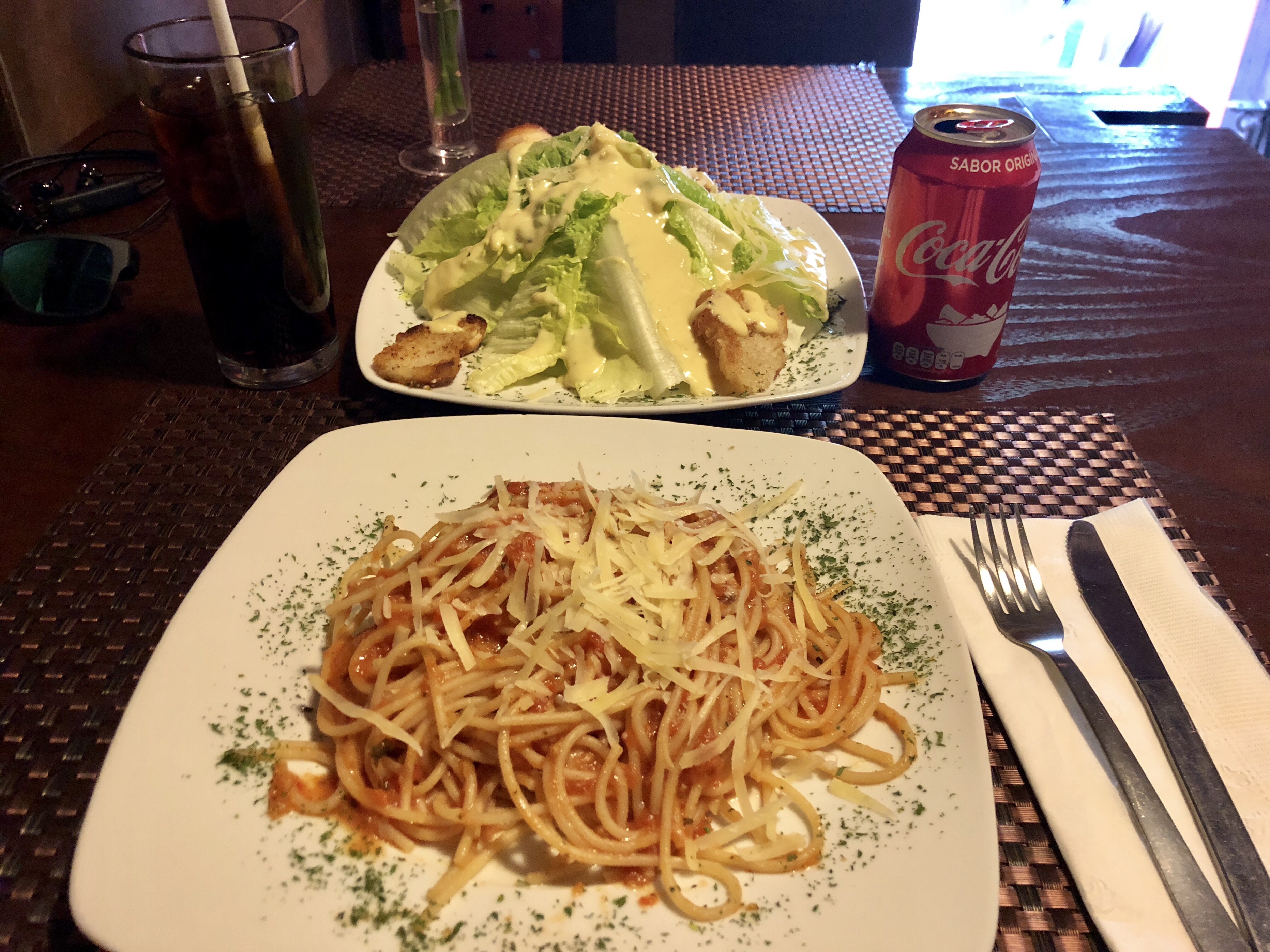 나는 치킨시저샐러드와 볼로냐스파게티와 콜라를 함께 주문하여 맛있게 먹었다.