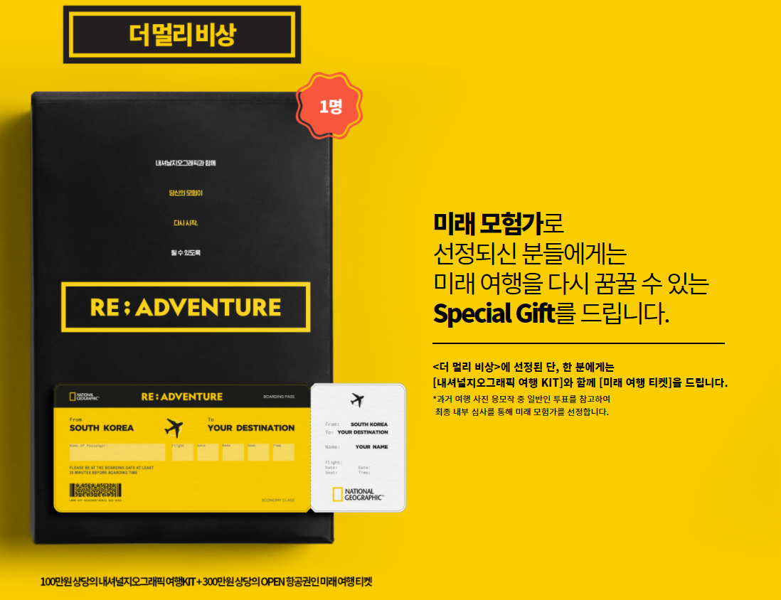 미래 모험가로 선정된 1인에게는 100만원 상당의 내셔널지오그래픽 여행KIT와 300만원 상당의