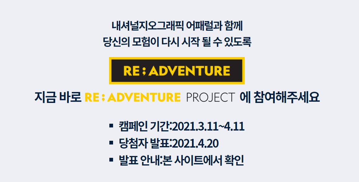 모험과 여행을 사랑했던 그 때, 추억이 담긴 사진을 지금 응모해주세요. 내셔널지오그래픽 어패럴이 미래에 당신이 떠날 모험을 지원합니다.