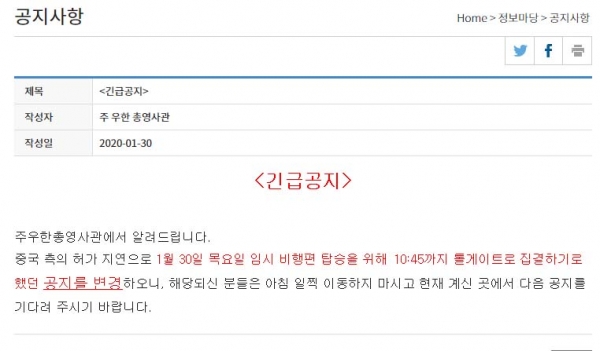 1/30일 우한에 있는 교민들을 수송하기 위해 계획되었던 대한항공 전세기 2대가