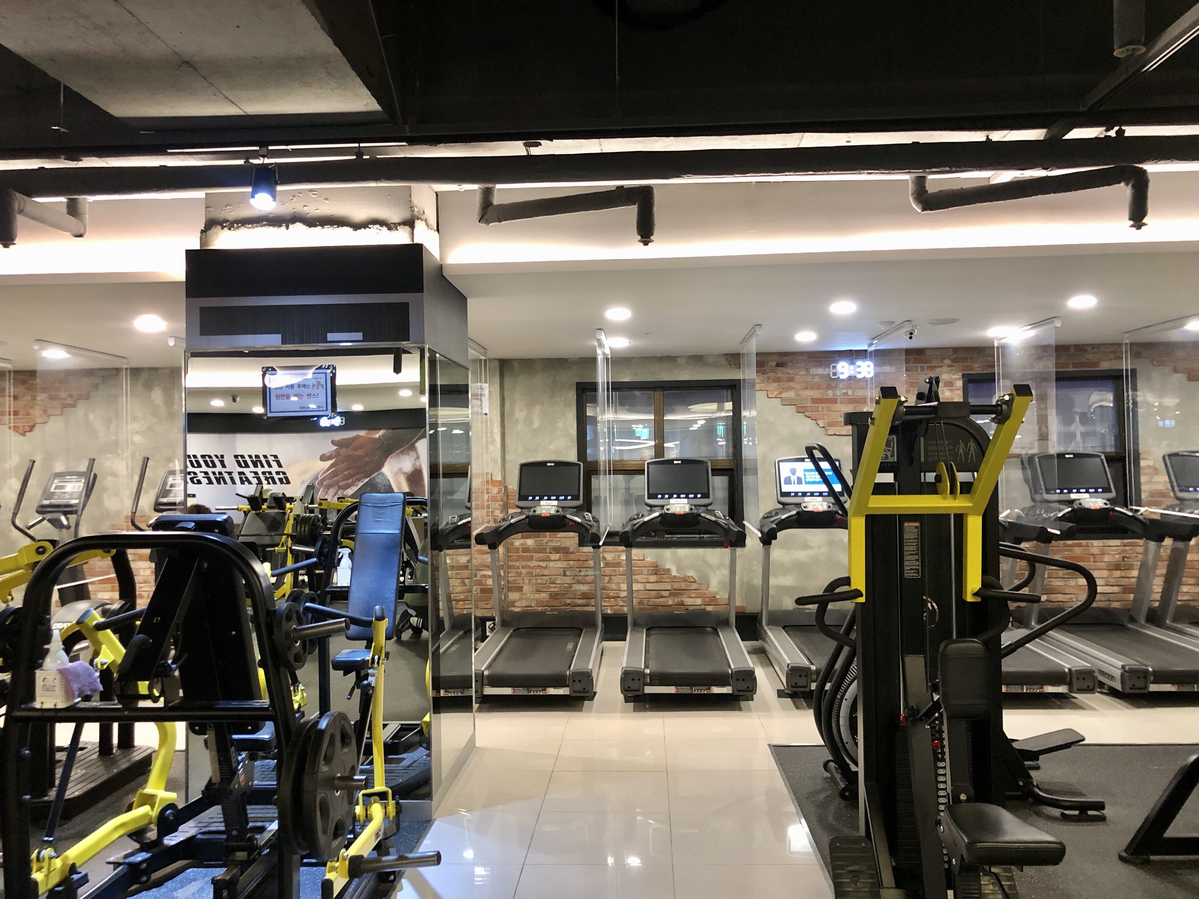 그리고 거의 20대 정도 되어 보이는 런닝머신도 기계 사이마다 칸막이가 다 설치되어 있습니다.