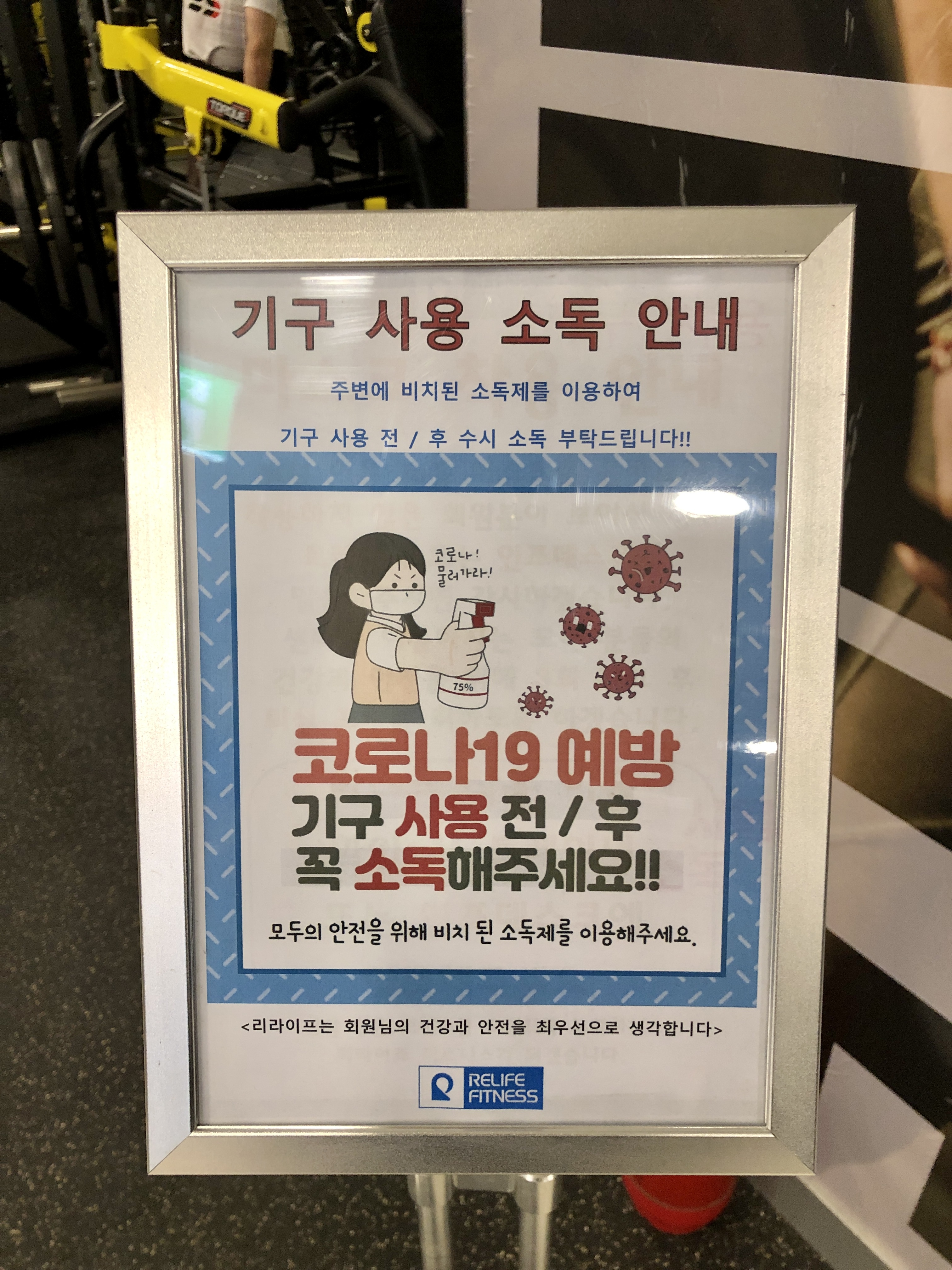 리라이프 피트니스 입구에서도 늘 체온을 재고 입장하지만 기구마다 소독제가 있어서 좋았습니다.