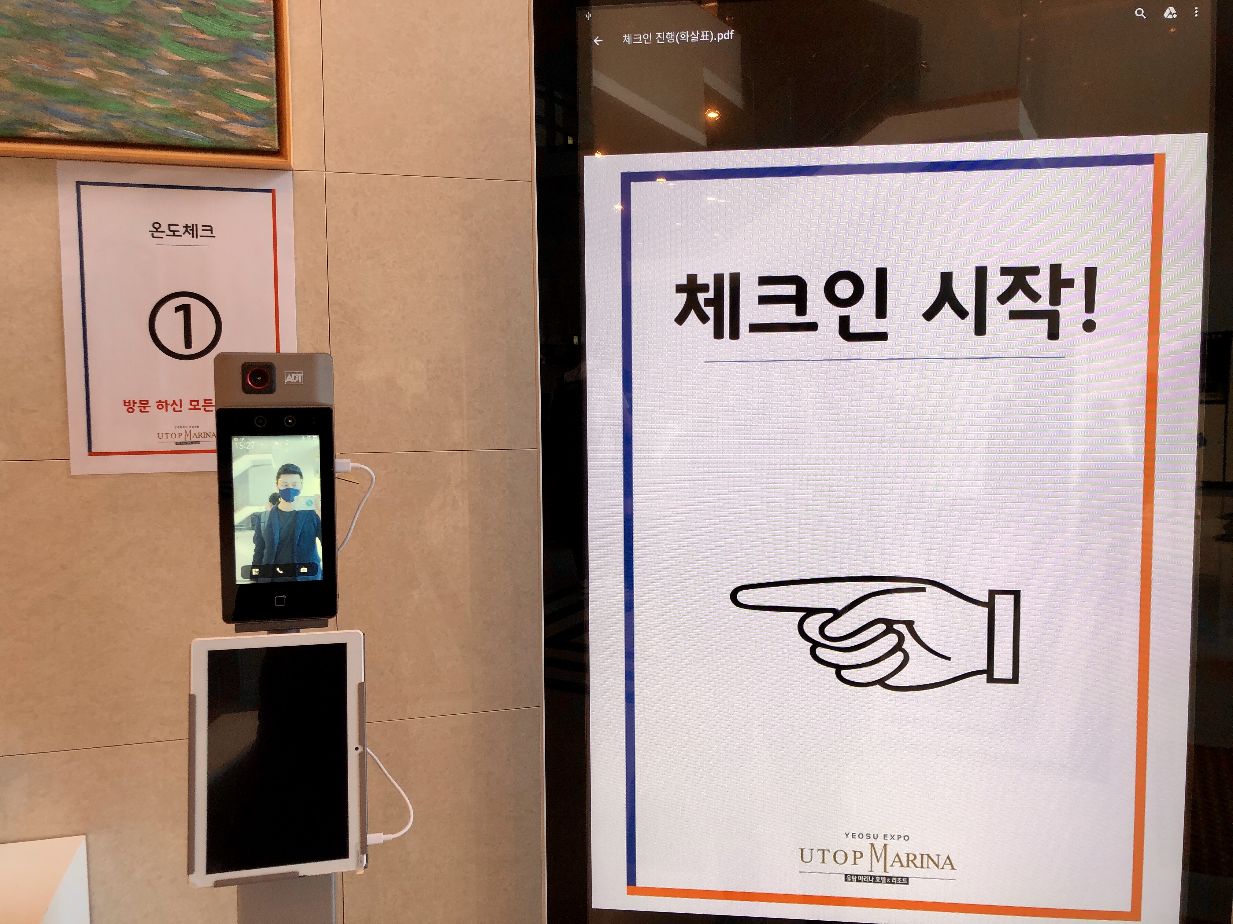 1층으로 올라가면 절차대로 온도체크와 문진표를 작성하고 체크인을 하기 위해 번호표를 뽑고 대기합니다.