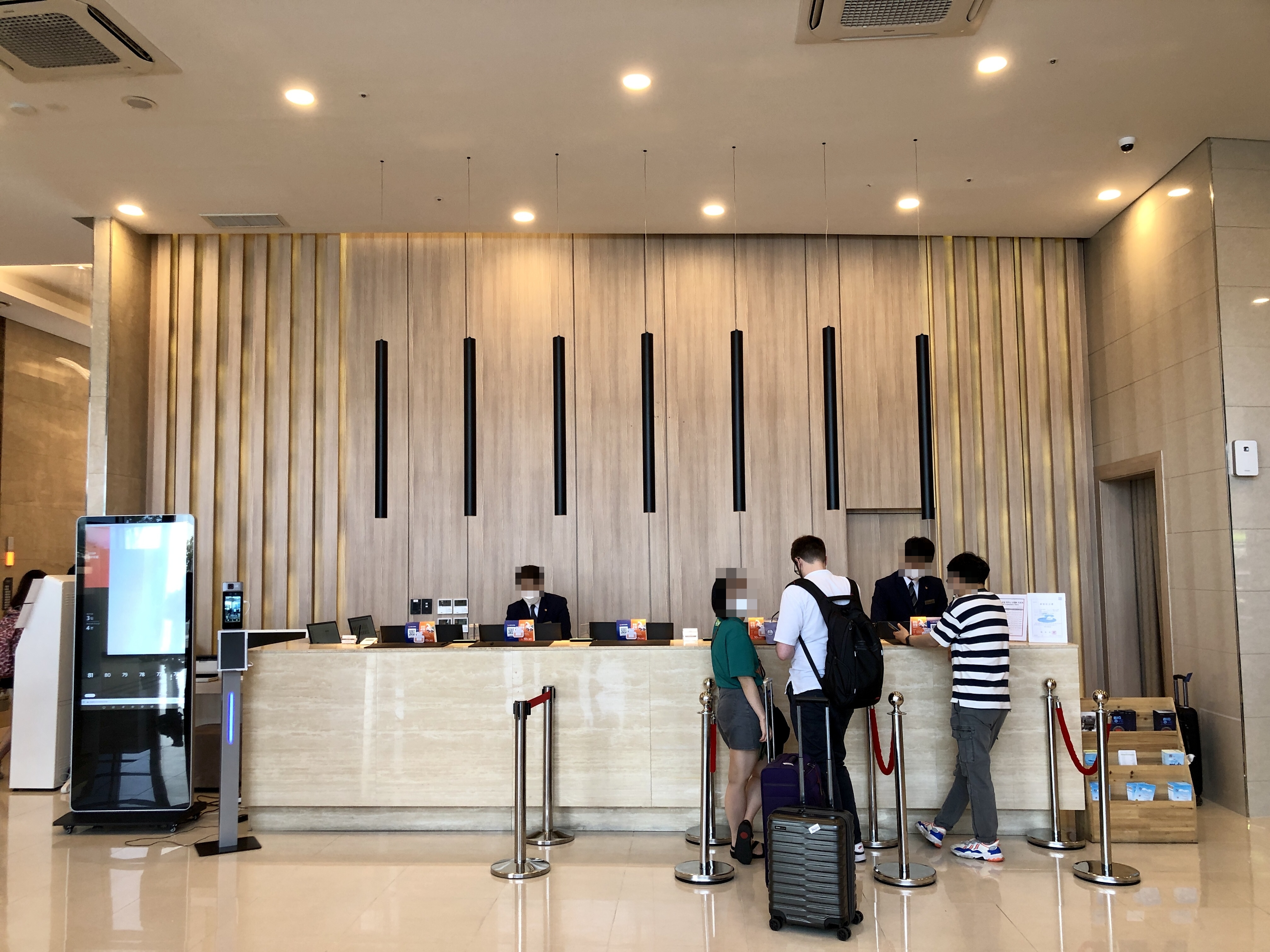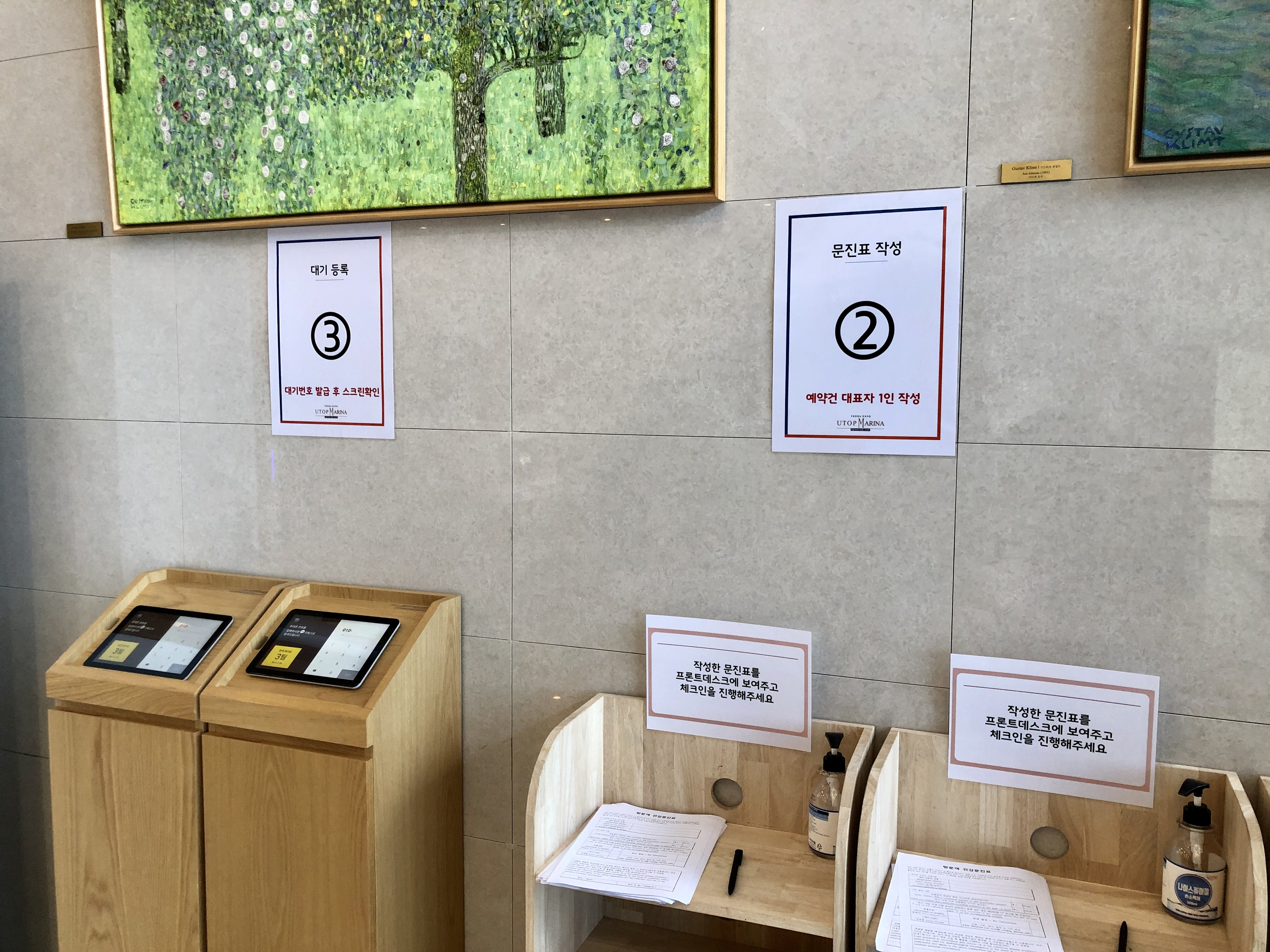 1층으로 올라가면 절차대로 온도체크와 문진표를 작성하고 체크인을 하기 위해 번호표를 뽑고 대기합니다.