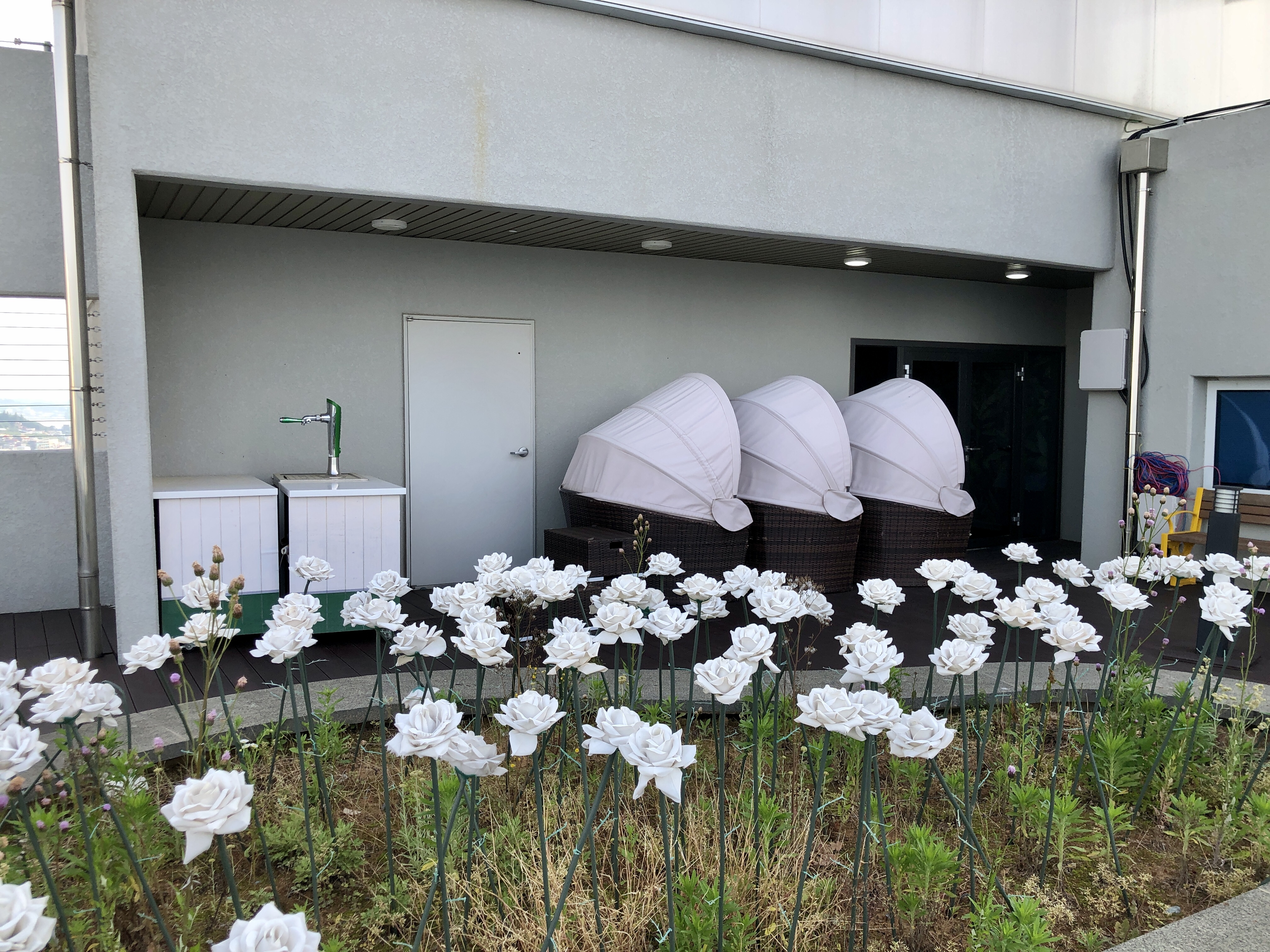옥상 전망대는 야간에 불이 켜지는 장미와 편히 앉아 쉴 수 있는 의자들로 꾸며져 있습니다.
