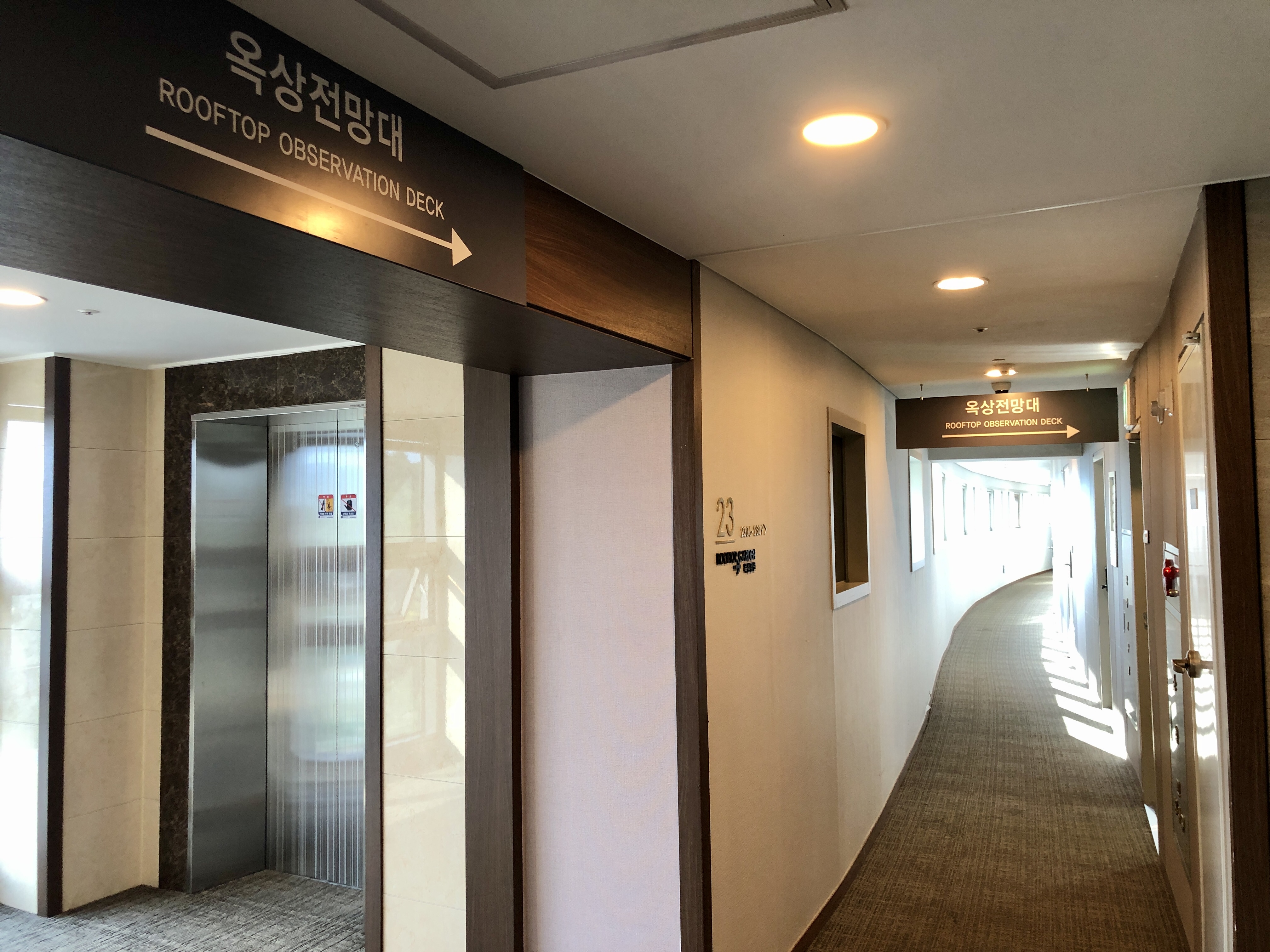 저녁을 먹으러 나가기로 했습니다. 옥상 전망대는 24층에 있는데 엘리베이터로 23층까지 올라가서