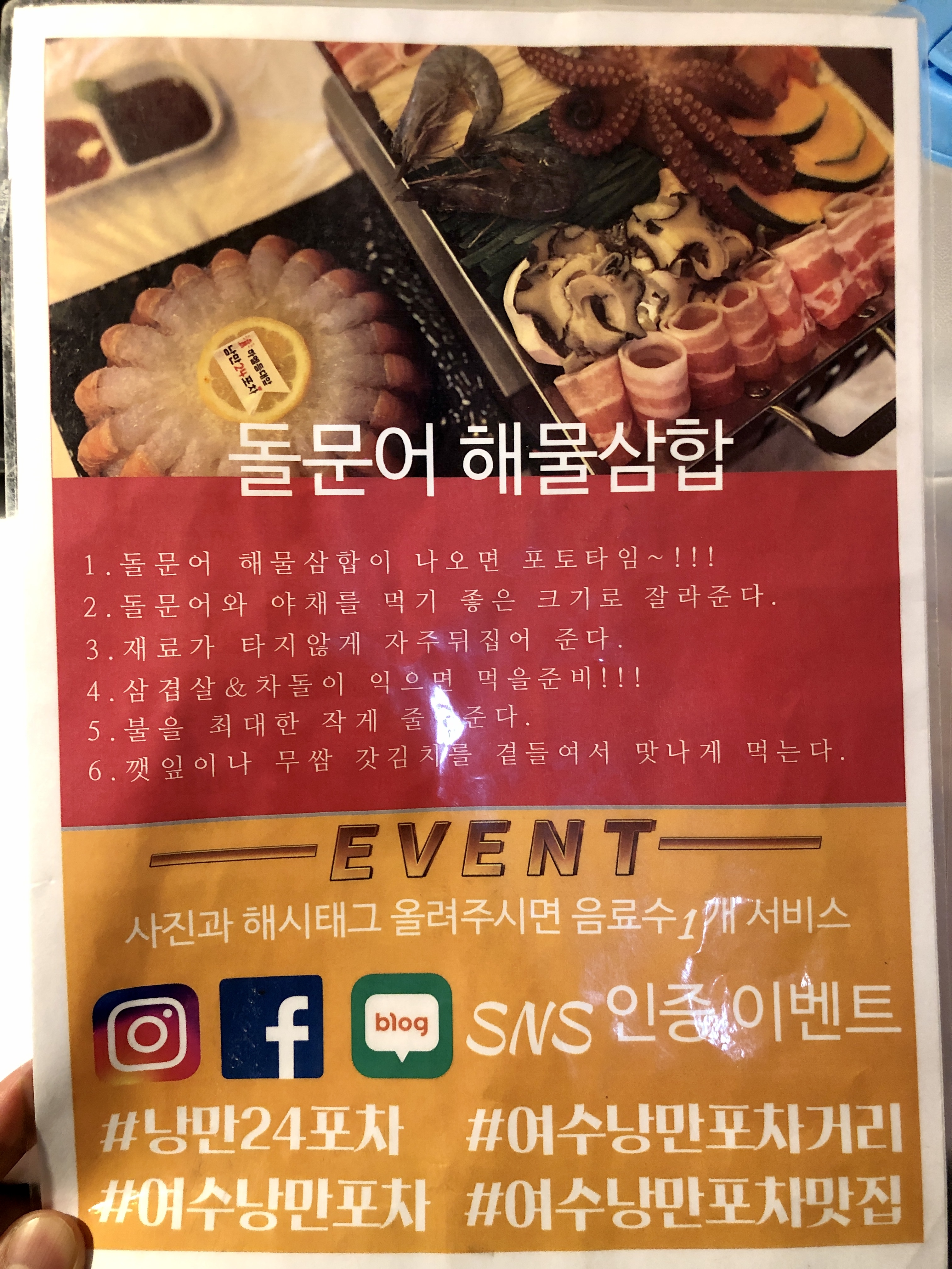 각 테이블마다 여수 낭만24포차의 메뉴와 대표 시그니처 메뉴인 돌문어 해물삼합을 맛있게 먹는방법이