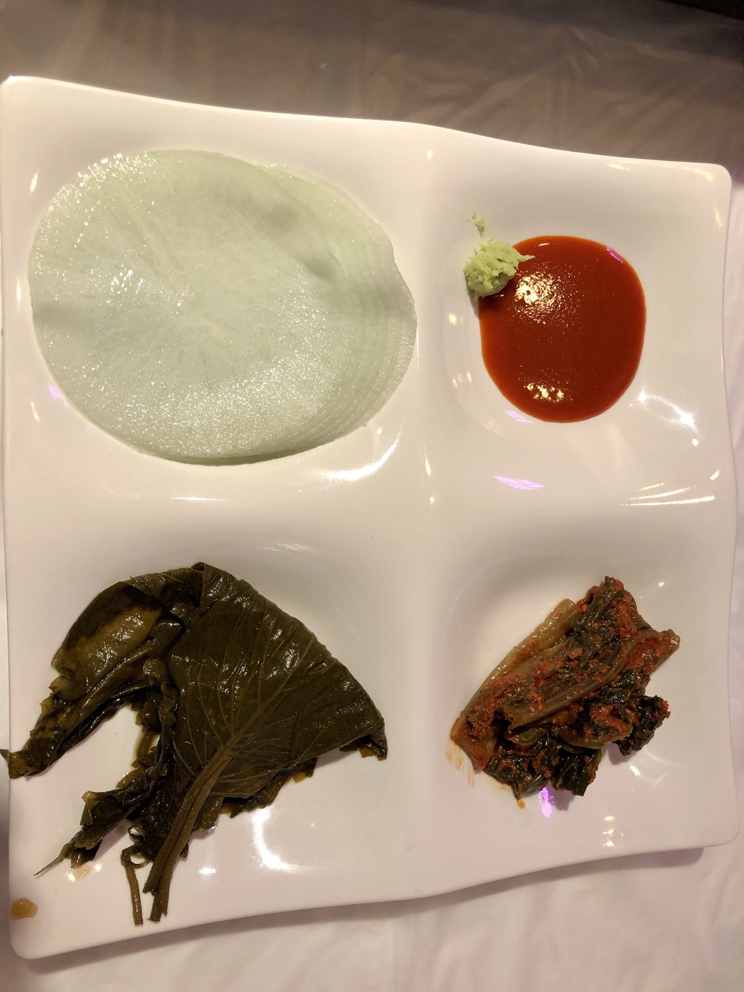자리를 잡고 앉으면 바로 기본반찬으로 깻잎과 쌈무 그리고 김치가 셋팅됩니다.