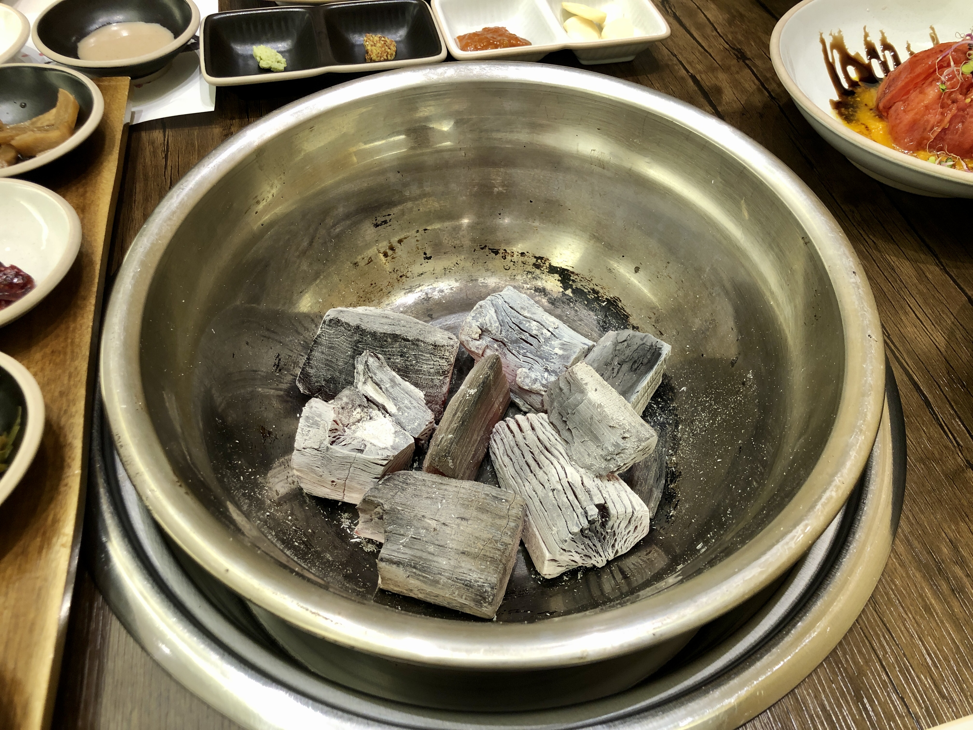 대야에 담긴 숯이 정말 신기한게 열기는 느껴지는데 생각보다 떡갈비가 타지도 않고 은은하게 잘 구워졌습니다.
